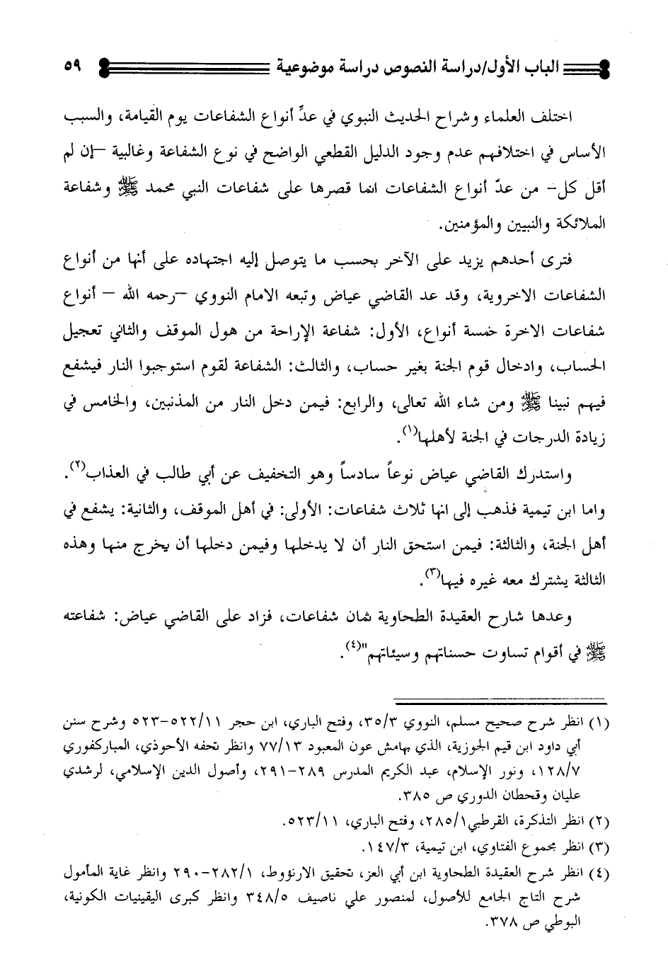 فترى احدهم يزيد على الآخر بحسب ما يتوصل اليه اجتهاده على انها من أنواع الشفاعات الاخروية، وقد عد القاضي عياض وتبعه الامام النوري -رحمها الله - أنواع شفاعات الاخرة خمسة أنواع، الأول: شفاعة الاراحه من هول الموقف والثاني تعجيل الحساب، وادخال قوم الجنة بغير حساب، والثالث: الشفاعة لقوم استوجبوا النار فيشفع فيهم نبينا صلى الله عليه وسلم ومن شاء الله تعالى، والرابع: فيمن دخل النار من المذنبين، والخامس في زيادة الدرجات في الجنة لاهلها (¬1).