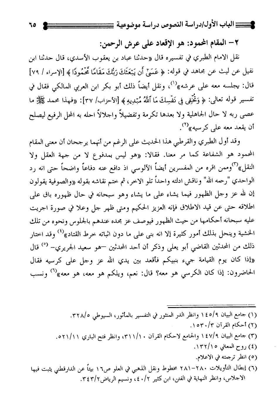 وقد أول الطبري والقرطبي هذا الحديث على الرغم من انهما يرجحان أن معنى المقام المحمود هو الشفاعة كما مر معنا. فقالا: ((هو ليس بمدفوع لا من جهة العقل ولا النقل)) (¬5) وممن اقره من المفسرين ايضاً الآلوسي اذ دافع عنه دفاعاً واضحاً حتى انه رد الواحدي "رحمه الله" وناقش ادلته واحداً تلو الاخر، ثم ختم نقاشه بقوله ((والصوفية يقولون أن لله عز وجل الظهور فيما يشاء على ما يشاء وهو سبحانه في حال ظهوره باق على اطلاقه حتى عن قيد الاطلاق فانه العزيز الحكيم ومتى ظهر جل وعلا في صورة اجريت عليه سبحانه احكامها من حيث الظهور فيوصف عز مجده عندهم بالجلوس ونحوه من تلك الخشية وينحل بذلك امور كثيرة إلا انه بنى على مادون اثباته خرط القتاد)) (¬6) وقد اختار ذلك من المحدثين القاضي أبو يعلى وذكر أن احد المحدثين -هو سعيد الجريري- (¬7) قال ((إذا كان يوم القيامة جيء بنبيكم فاقعد بين يدي الله عز وجل على كرسيه فقال الحاضرون: إذا كان الكرسي هو معه؟ قال: نعم، ويلكم هو معه، هو معه)) (¬8) ونسب