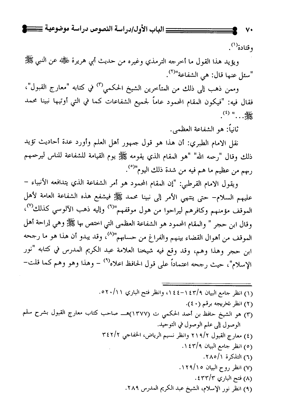 وممن ذهب إلى ذلك من المتأخرين الشيخ الحكمي (¬3) في كتابه "معارج القبول"، فقال فيه: "فيكون المقام المحمود عاماً لجميع الشفاعات كما في التي أويتها نبياً محمد - صلى الله عليه وسلم - ... " (¬4).