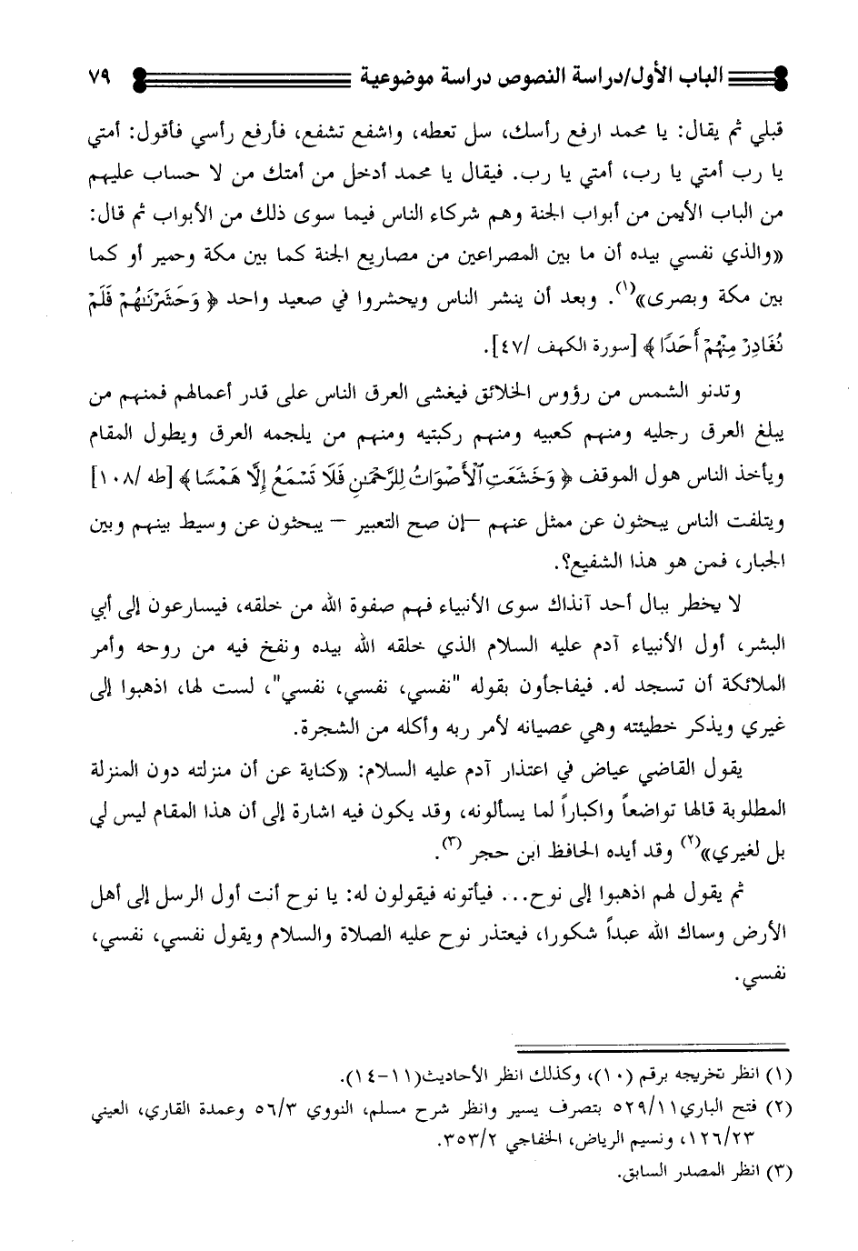 قبلي ثم يقال: يا محمد أرفع رأسك سل تعطه، واشفع تشفع، فأرفع رأسي فاقول: أمتي يا رب أمتي يا رب، أمتي يا رب. فيقال يا محمد أدخل من امتك من لا حساب عليهم من الباب الأيمن من أبواب الجنة وهم شركاء الناس فيما سوى ذلك من الأبواب ثم قال: ((والذي نفسي بيده أن ما بين المصراعين من مصاريع الجنة كما بين مكة وحمير أو كما بين مكة وبصرى)) (¬1). وبعد أن ينشر الناس ويحشروا في صعيد واحد ((وحشرناهم فلم نغادر منهم أحداً)) (¬2).