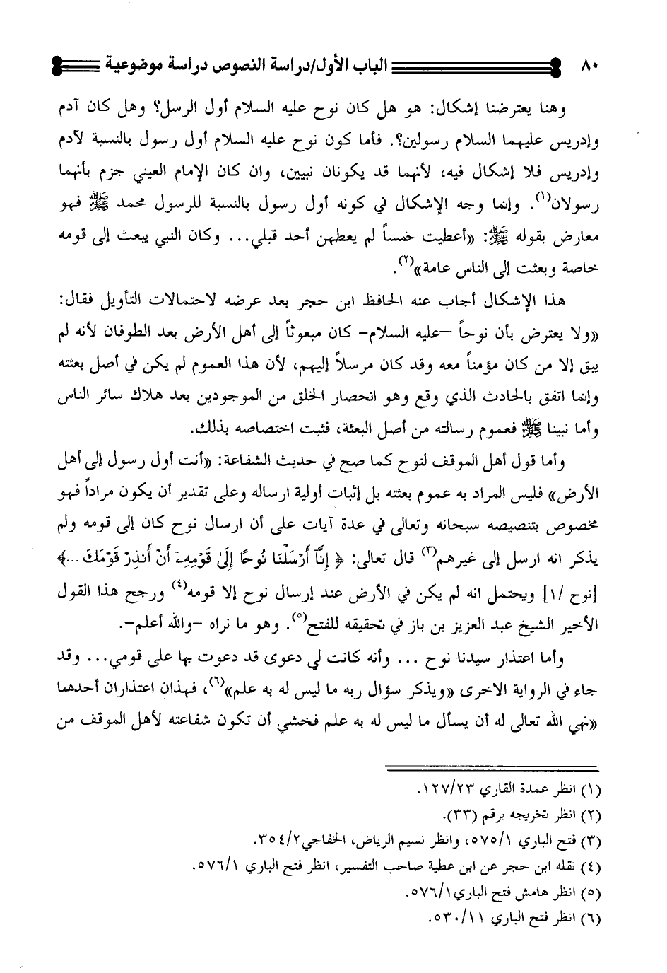 وهنا يعترضنا إشكال: هو هل كان نوح عليه السلام أول الرسل؟ وهل كان آدم وإدريس عليهما السلام رسولين؟. فأما كون نوح عليه السلام أول رسول بالنسبة لآدم وإدريس فلا إشكال فيه، لأنهما قد يكونان نبيين، وان كان الإمام العيني جزم بأنهما رسولان (¬1). وإنما وجه الإشكال في كونه أول رسول بالنسبة للرسول محمد - صلى الله عليه وسلم - فهو معارض بقوله - صلى الله عليه وسلم -: ((أعطيت خمساً لم يعطهن أحد قبلي ... وكان النبي يبعث إلى قومه خاصة وبعثت إلى الناس عامة)). (¬2)