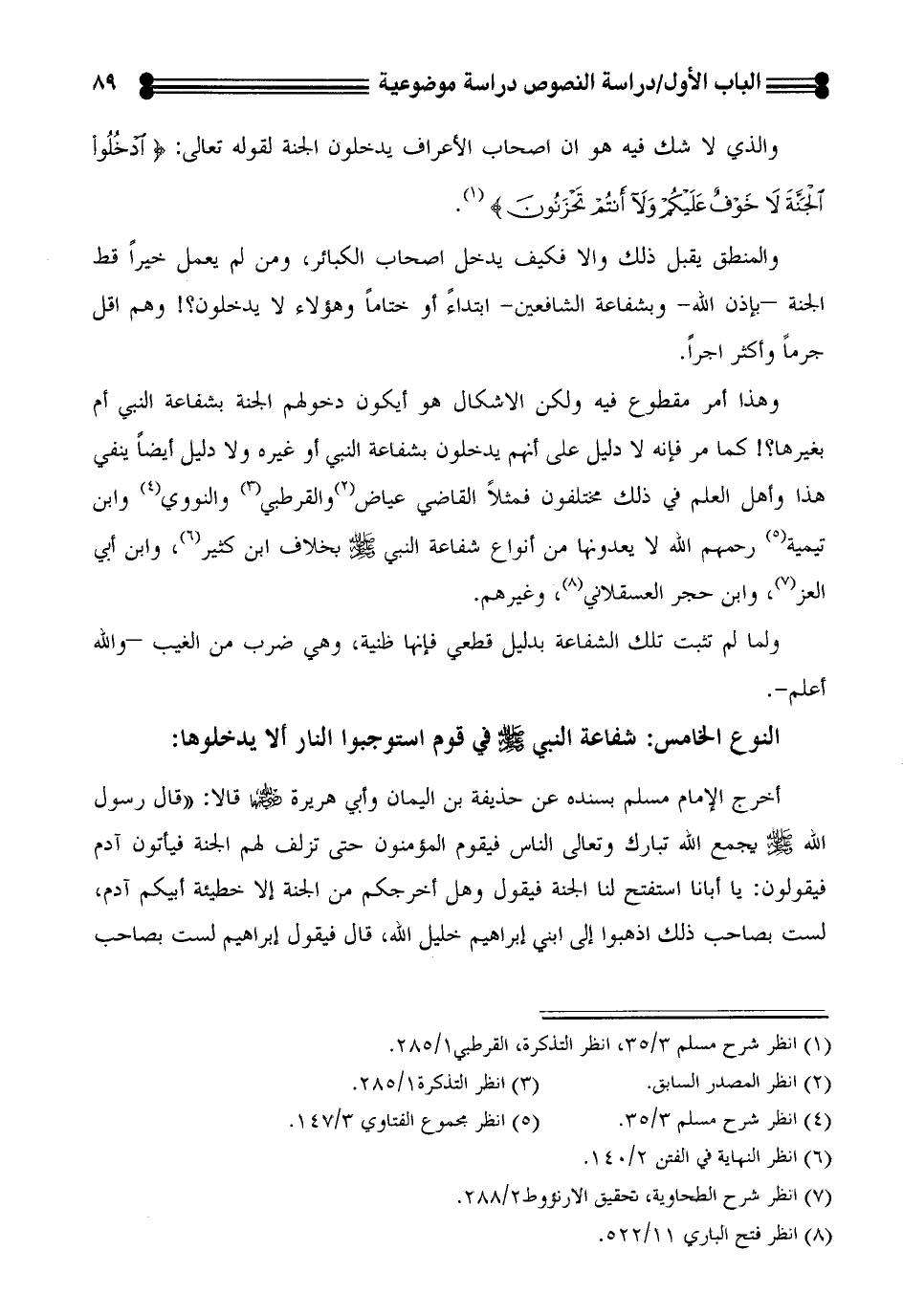 وهذا أمر مقطوع فيه ولكن الاشكال هو أيكون دخولهم الجنة بشفاعة النبي ام بغيرها؟! كما مر فانه لا دليل على انهم يدخلون بشفاعة النبي أو غيره ولا دليل ايضاً ينفي هذا وأهل العلم في ذلك مختلفون فمثلاً القاضي عياض (¬2) والقرطبي (¬3) والنووي (¬4) وإبن تيمية (¬5) رحمهم الله لا يعدونها من أنواع شفاعة النبي - صلى الله عليه وسلم - بخلاف إبن كثير (¬6)، وإبن أبي العز (¬7)، وإبن حجر العسقلاني (¬8)، وغيرهم.