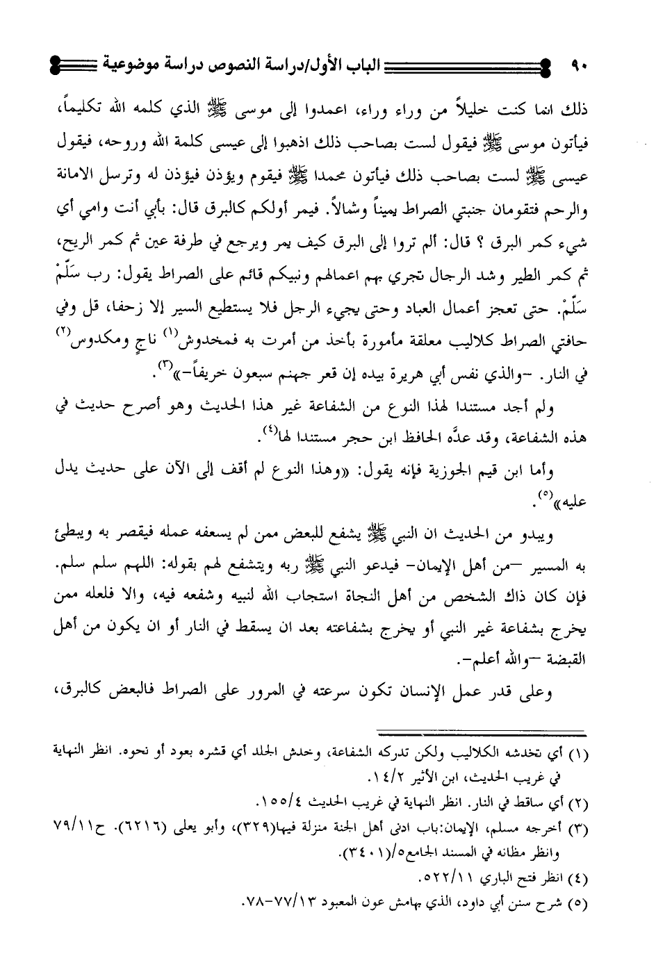 ذلك انما كنت خليلاً من وراء وراء، اعمدوا إلى موسى - صلى الله عليه وسلم - الذي كلمه الله تكلما، فيأتون موسى - صلى الله عليه وسلم - فيقول لست بصاحب ذلك اذهبوا إلى عيسى كلمة الله وروحه، فيقول عيسى - صلى الله عليه وسلم - لست بصاحب ذلك فيأتون محمدا - صلى الله عليه وسلم - فيقوم ويؤذن فيؤذن له وترسل الامانة والرحم فتقومان جنبتي الصراط يميناً وشمالاً. فيمر أولكم كالبرق قال: بأبي أنت وامي أي شيء كمر البرق؟ قال: الم ترو إلى البرق كيف يمر ويرجع في طرفه عين ثم تم كمر الريح، ثم كمر الطير وشد الرجال تجري بهم اعمالهم ونبيكم قائم على الصراط يقول: رب سَلَّمْ سَلَّمْ. حتى تعجز أعمال العباد وحتى يجيء الرجل فلا يستطيع السير إلا زحفا، قل وفي حافتي الصراط كلاليب معلقة مأمورة باخذ من امرت به فمخدوش (¬1) ناجٍ ومكدوس (¬2) في النار. -والذي نفس أبي هريرة بيده ان قعر جهنم سبعون خريفاً-)) (¬3).