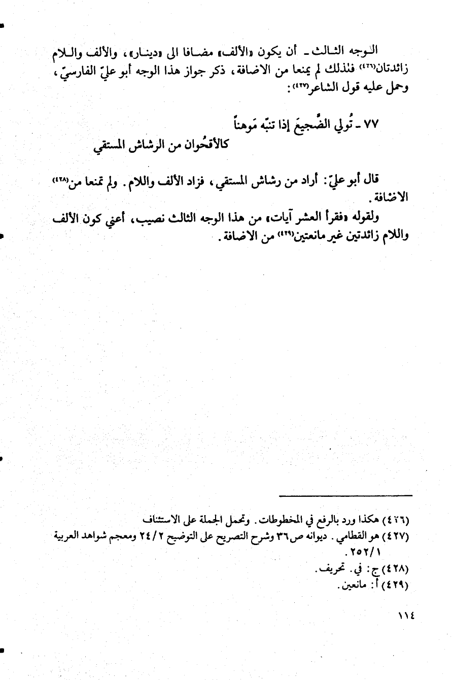 الوجه الثالث- أن يكون "الألف" مضافا الى "دينار" والألف واللام زائدتان (¬426) فلذلك لم يمنعا من الإضافة، ذكر جواز هذا الوجه أبو على الفارسي، وحمل عليه قول الشاعر (¬427):
