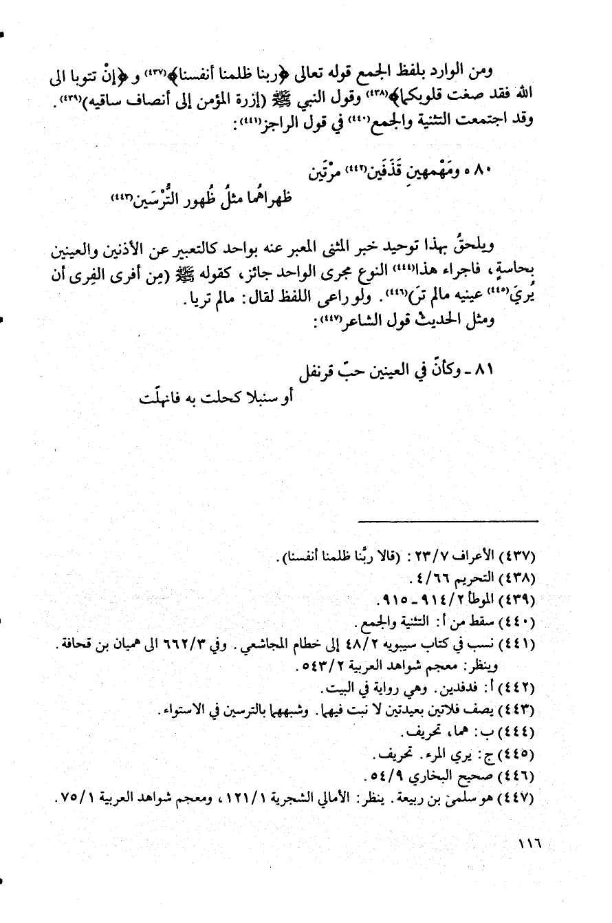 ومن الوارد بلفظ الجمع قوله تعالى {رَبَّنَا ظَلَمْنَا أَنْفُسَنَا} (¬437) و {ِنْ تَتُوبَا إِلَى اللَّهِ فَقَدْ صَغَتْ قُلُوبُكُمَا} (¬438) وقول النبي - صلى الله عليه وسلم - (إزرة المؤمن إلى أنصاف ساقيه) (¬439).