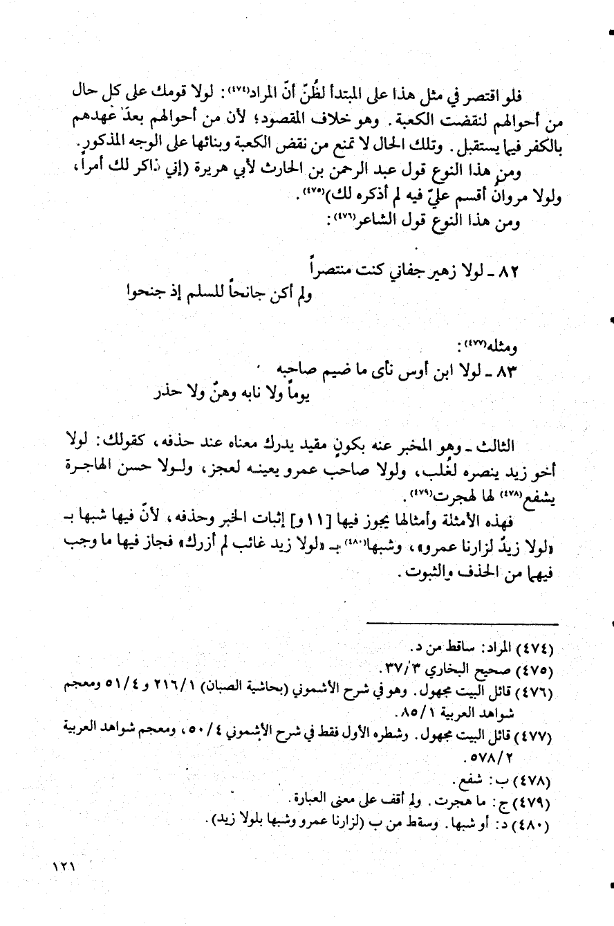 فلو اقتصر في مثل هذا على المبتدأ لظُن أن المراد (¬474): لولا قومك على كل حال من أحوالهم لنقضت الكعبة وهو خلاف المقصود؛ لأن من أحوالهم بعد عهدهم بالكفر فيما يستقبل. وتلك الحال لا تمنع من نقض الكعبة وبنائها على الوجه المذكور.