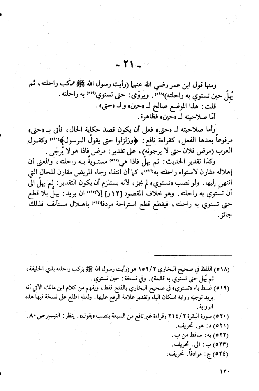 (¬518) اللفظ فى صحيح البخاري 2/ 156 هو (رأيت رسول الله - صلى الله عليه وسلم - ركب راحلته بذي الحليفة، ثم يُهل حتى تستوي به قائمة). وفى نسخة: حين تستوي.
