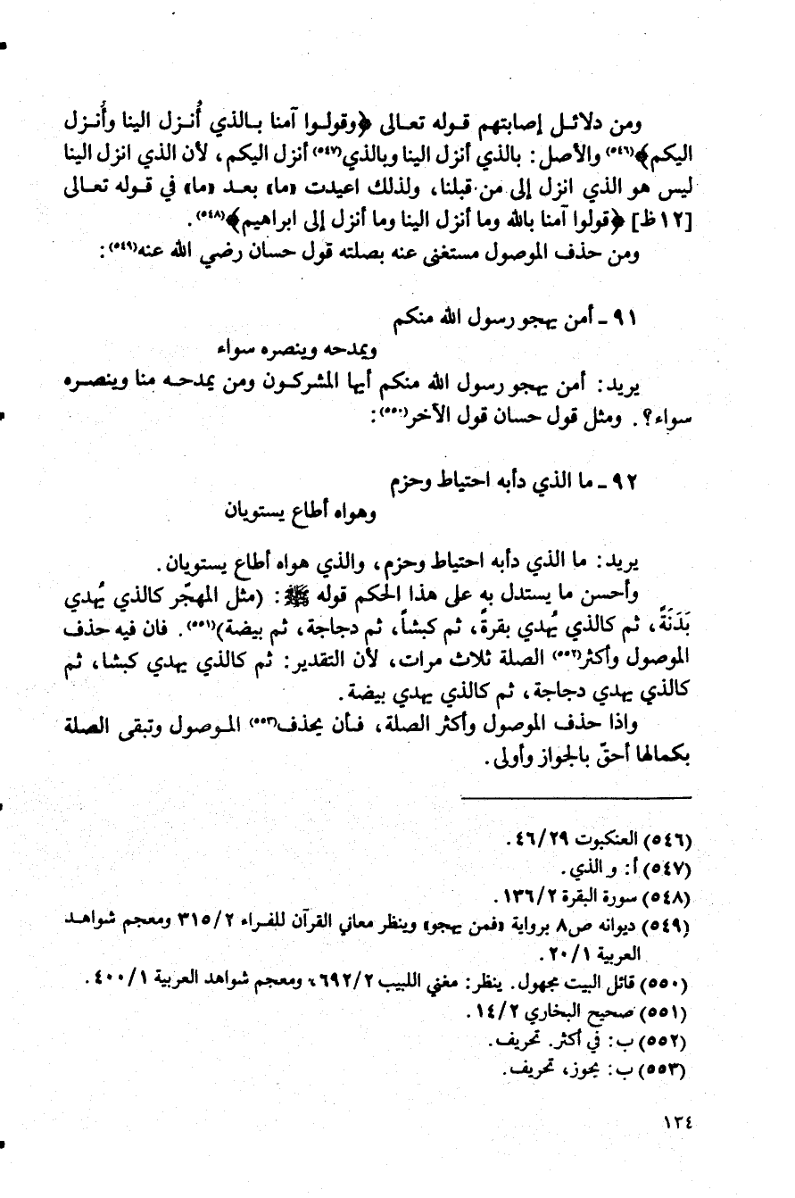 ومن دلائل إصابتهم قوله تعالى {وَقُولُوا آمَنَّا بِالَّذِي أُنْزِلَ إِلَيْنَا وَأُنْزِلَ إِلَيْكُمْ} (¬546) والأصل: بالذي أنزل الينا وبالذي (¬547) أنزل اليكم؛ لأن الذي أنزل الينا ليس هو الذي أنزل إلى من قبلنا ,ولذلك أعيدت "ما" بعد "ما" في قوله تعالى [12ظ]، {قُولُوا آمَنَّا بِاللَّهِ وَمَا أُنْزِلَ إِلَيْنَا وَمَا أُنْزِلَ إِلَى إِبْرَاهِيمَ} (¬548).
