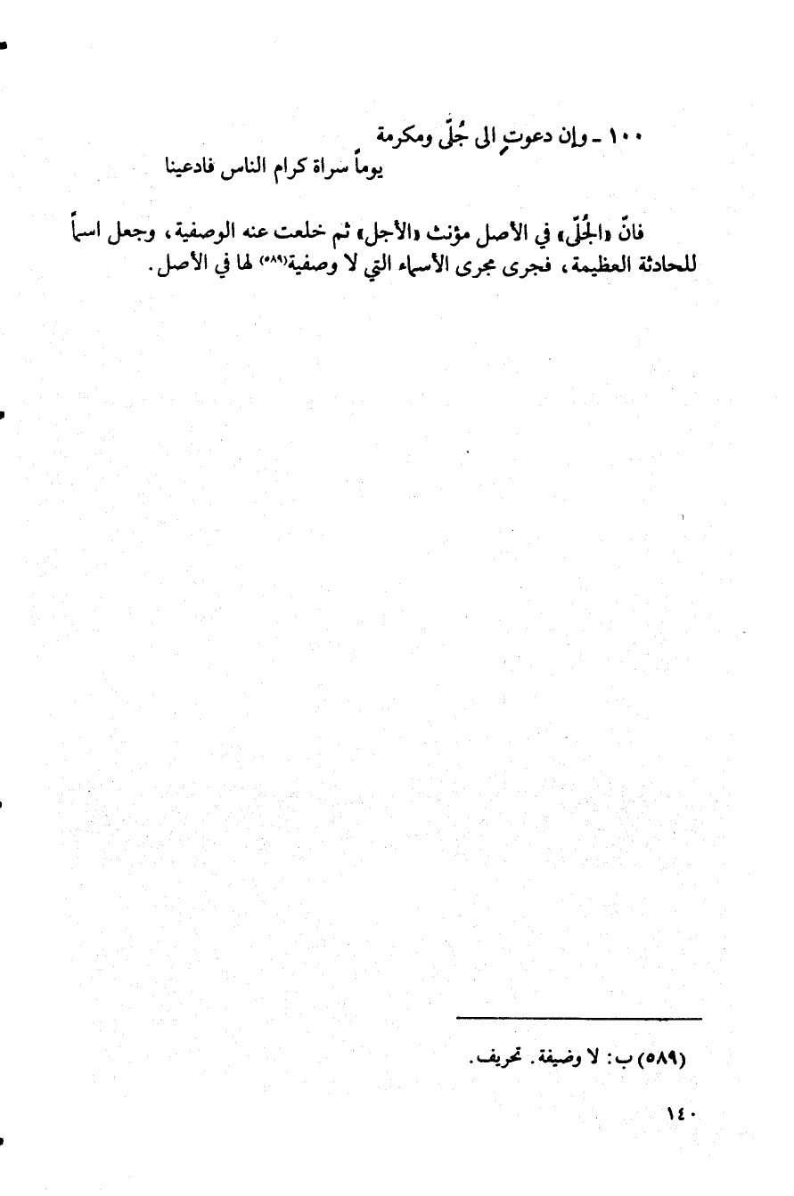 فإن "الجلى" في الأصل مؤنث "الأجل" ثم خلعت عنه الوصفية، وجعل اسمًا للحادثة العظيمة، فجرى مجرى الأسماء التي لا وصفية (¬589) لها في الأصل.