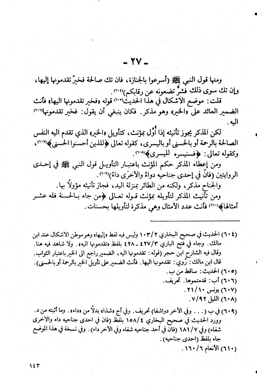 (¬604) الحديث في صحيح البخاري 2/ 153 وليس فيه لفظ" إليها " وهو موطن الإشكال عند ابن مالك. وجاء في فتح الباري 3/ 427 - 428 بلفظ" تقدمونها إليها. ولا شاهد فيه هنا، وقال فيه الشارح ابن حجر (قوله: تقدمونها إليه، الضمير راجع إلى الخير باعتبار الثواب.