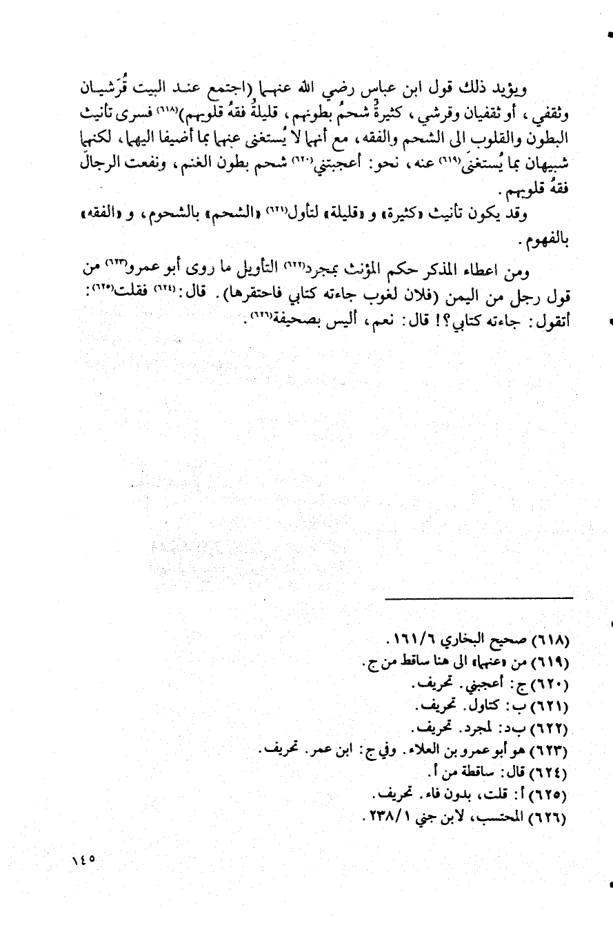 ومن اعطاء المذكر حكم المؤنث بمجرد (¬622) التأويل ما روى أبو عمرو (¬623) من قول رجل من اليمن (فلان لغوب جاءته كتابى فاحتقرها). قال: (¬624) فقلت (¬625): أتقول: جاءته كتابي؟! قال: نعم، أليس بصحيفة (¬626).