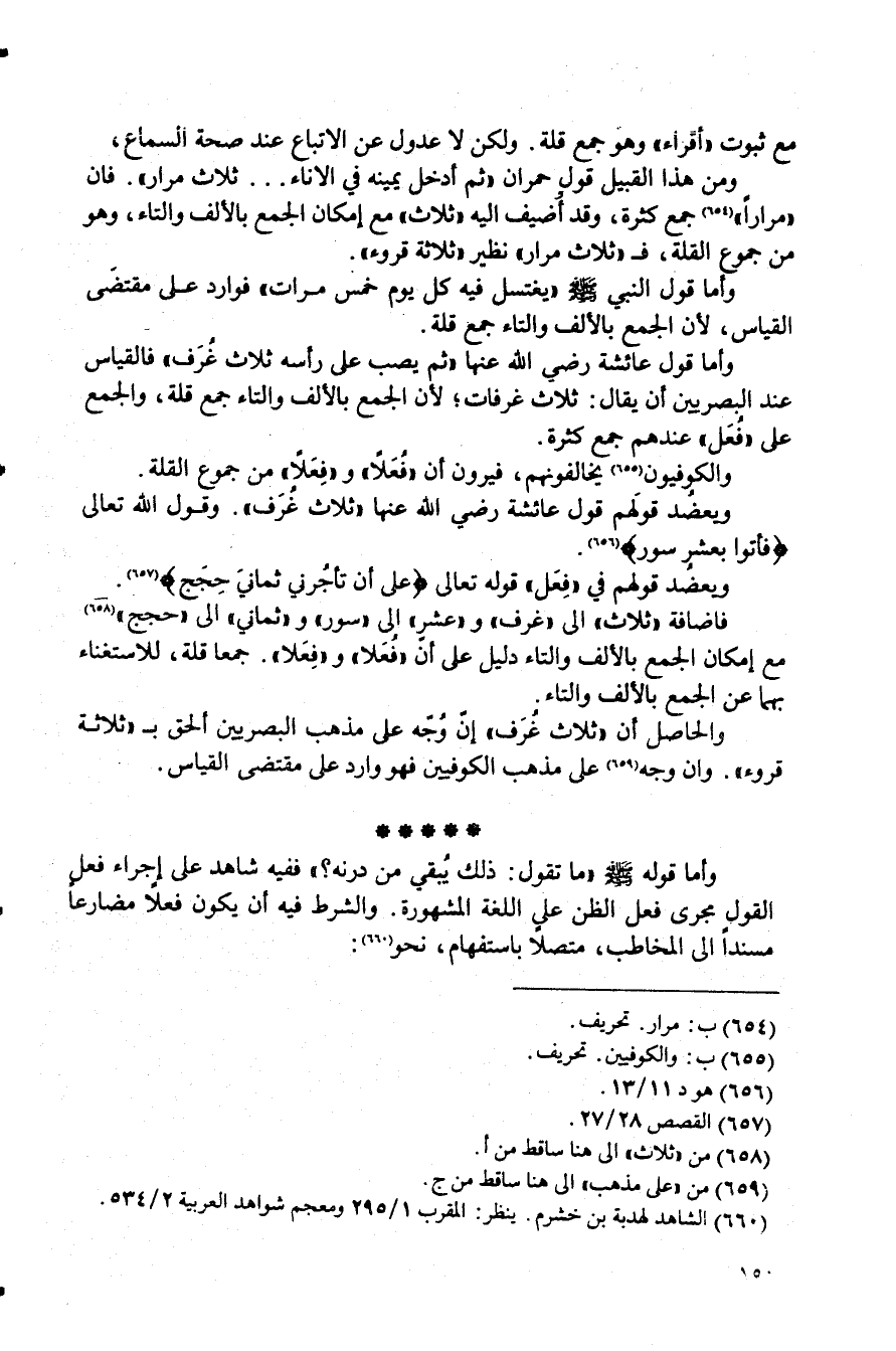 مع ثبوت" أقرأء" وهو جمع قلة. ولكن لا عدول عن الاتباع عند صحة السماع , ومن هذا القبيل قول حمران "ثم أدخل يمينه في الإناء ... ثلاث مرار". فإن "مرارًا" (¬654) جمع كثرة، وقد أُضيف إليه "ثلاث" مع إمكان الجمع بالألف والتاء، وهو من جموع القلة، ف" ثلاث مرار" نظير "ثلاثة قروء".