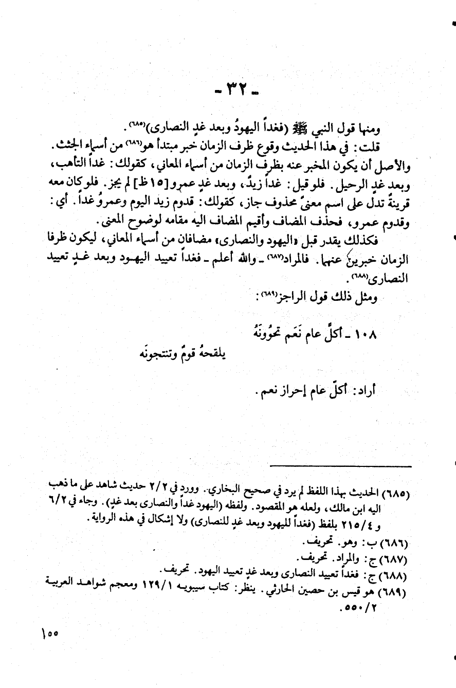 (¬685) الحديث بهذا اللفظ لم يرد في صحيح البخاري-. وورد في 2/ 2 حديث شاهد على ما ذهب إليه ابن مالك، ولعله هو المقصود. ولفظه (اليهود غدًا والنصارى بعد غدٍ). وجاء في 2/ 6