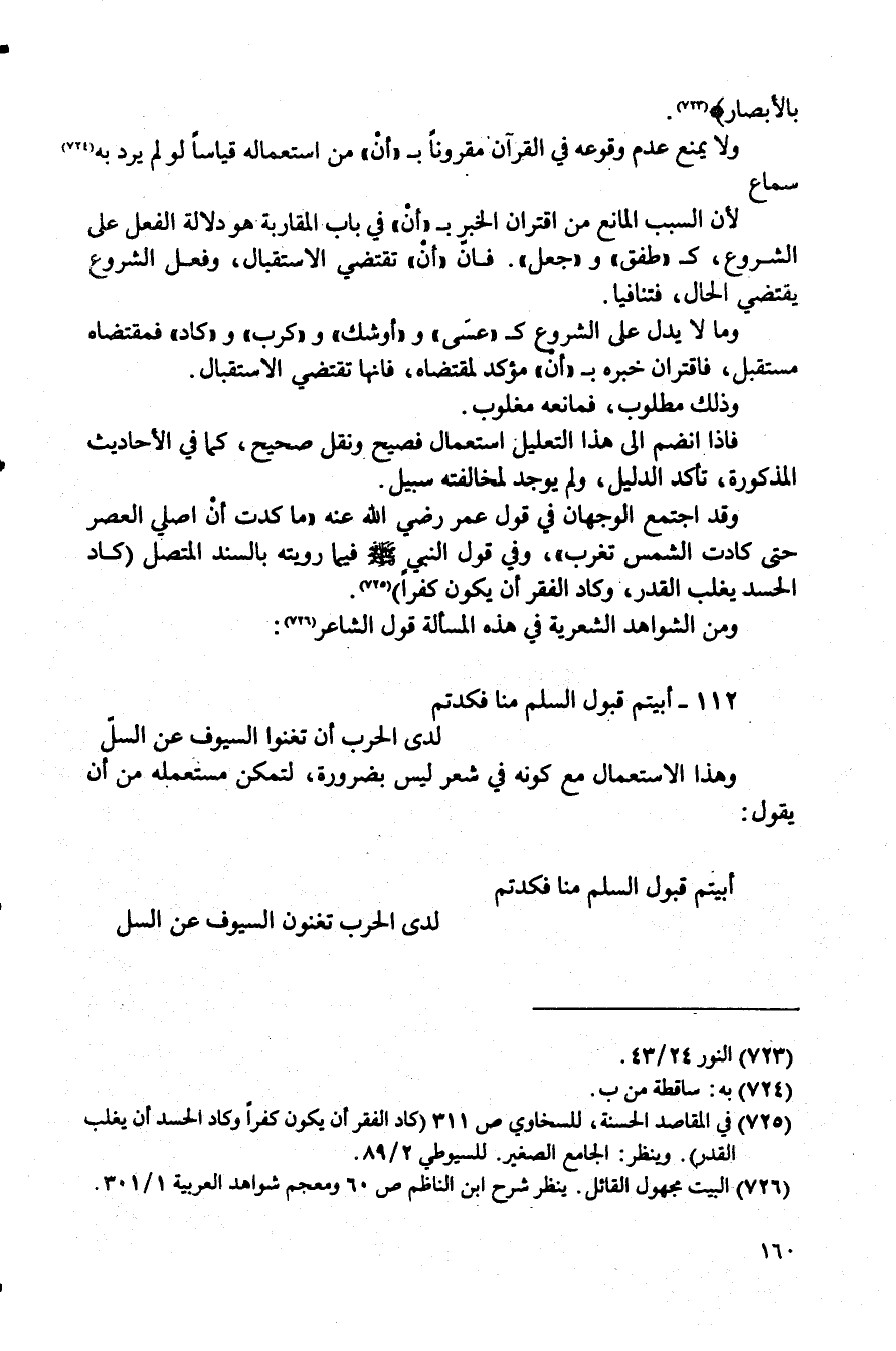 وقد اجتمع الوجهان في قول عمر رضي الله عنه "ما كدت أن أصلِي العصر حتى كادت الشمس تغرب"، وفي قول النبي - صلى الله عليه وسلم - فيما رويته بالسند المتصل (كاد الحسد يغلب القدر، وكاد الفقر أن يكون كفرًا) (¬725).