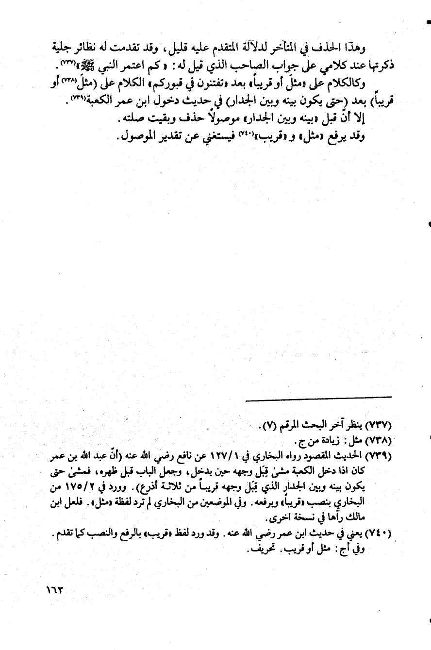 (¬739) الحديث المقصود رواه البخاري في 1/ 127 عن نافع رضي الله عنه (أن عبد الله بن عمر كان إذا دخل الكعبة مشى قبل وجهه حين يدخل، وجعل الباب قبل ظهره، فمشى حتى يكون بينه ويين الجدار الذي قبل وجهه قريبًا من ثلاثة اذرع). وورد في 2/ 175 من البخاري بنصبا "قريبًا" ويرفعه. وفي الموضعين من البخاري لم ترد لفظة "مثل"، فلعل ابن مالك رآها فى نسخة أخرى.