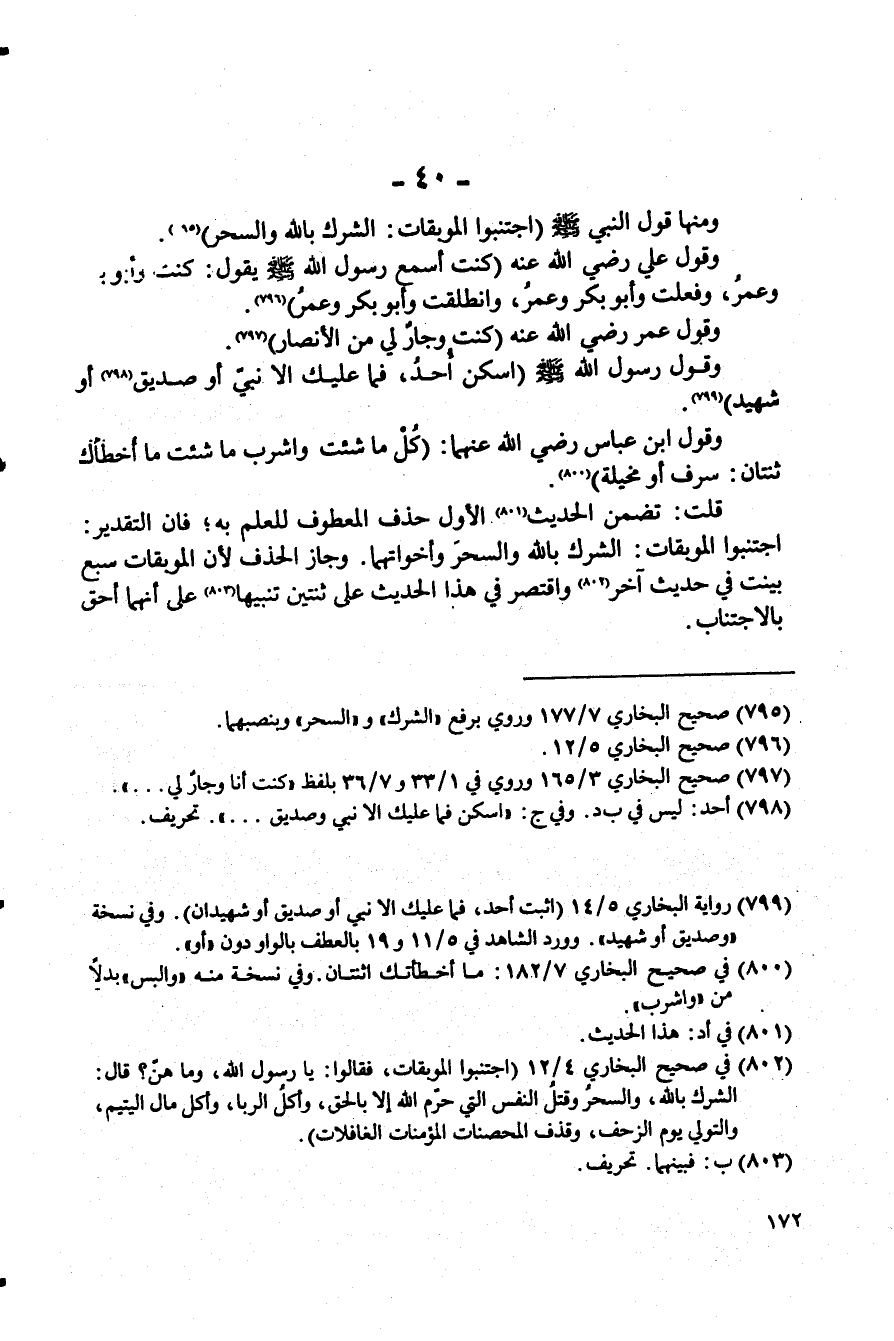 (¬802) في صحيح البخاري 4/ 12 (اجتنبوا الموبقات، فقالوا: يا رسول الله، وما هن؟ قال: الشرك بالله، والسحرُ وقتلُ النفس التي حرم الله إلا بالحق، وأكلُ الربا، وأكل مال اليتيم، والتولِي يوم الزحف، وقذف المحصنات المؤمنات الغافلات).