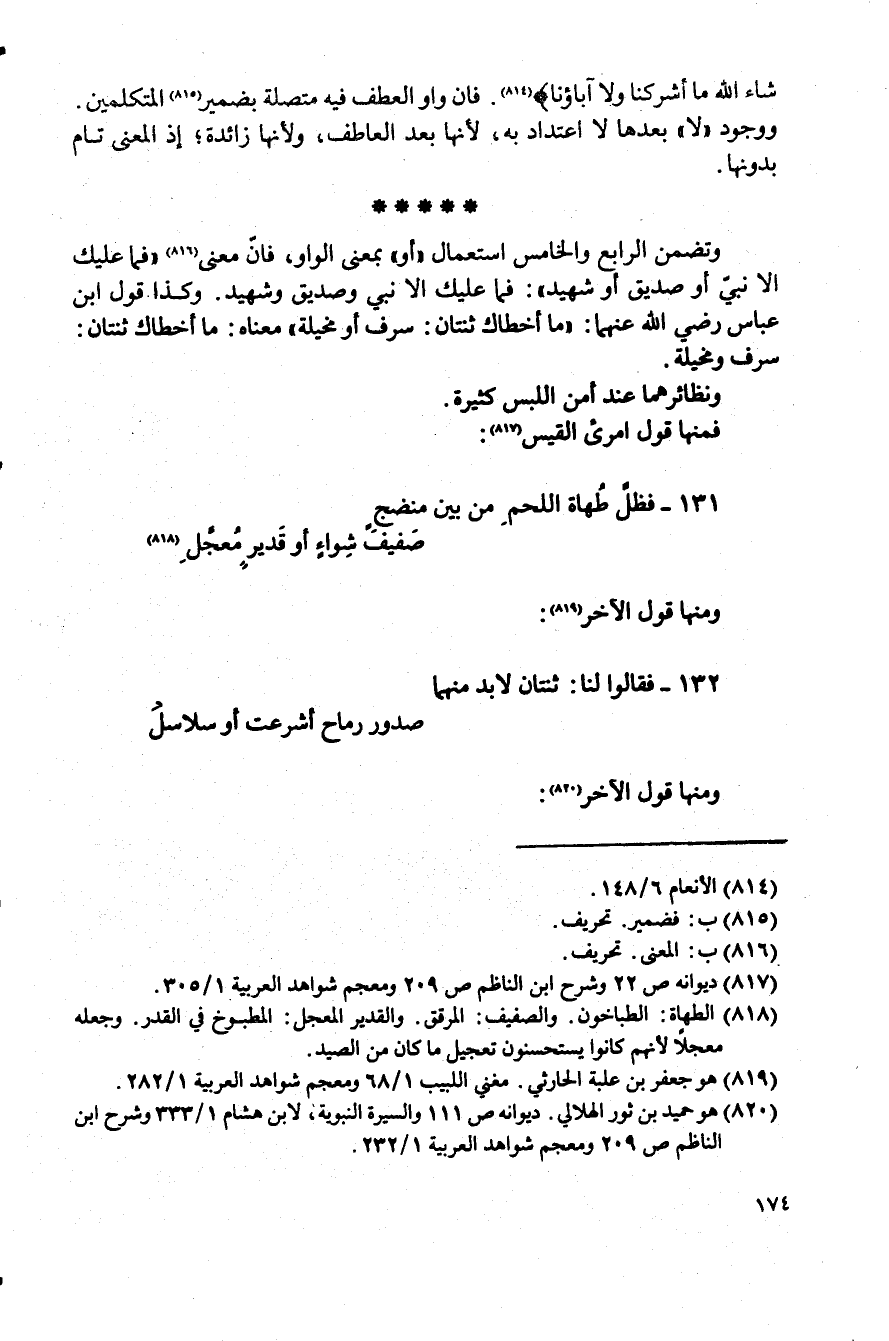 شَاءَ اللَّهُ مَا أَشْرَكْنَا وَلَا آبَاؤُنَا} (¬814). فإن واو العطف فيه متصلة بضمير. (¬815) المتكلمين.