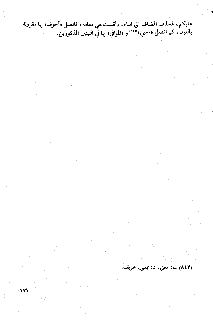 عليكم، فحذف المضاف الى الياء، وأقيمت هي مقامه، فاتصل "أخوف" بها مقرونة بالنون، كما اتصل (معيي) (842) و "الموافي" بها في البيتين المذكورين.