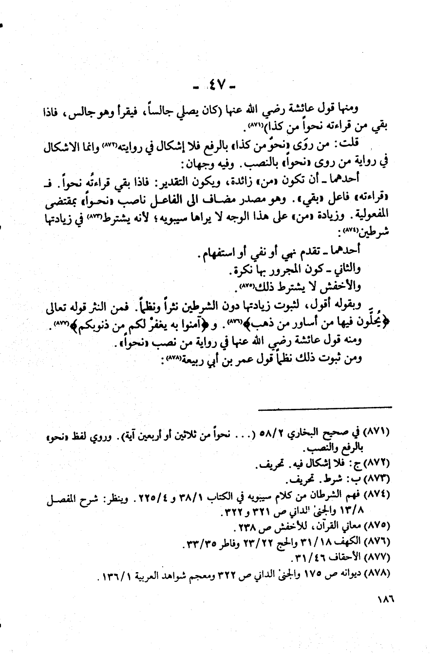 أحدهما- أن تكون "من" زائدة، ويكون التقدير: فإذا بقي قراءنُه نحوًا. ف "قراءته" فاعل "بقي". وهو مصدر مضاف إلى الفاعل ناصب "نحواَ" بمقتضى المفعولية. وزيادة "من" على هذا الوجه لا يراها سيبويه؛ لأنه يشترط (¬873) في زيادتها شرطين (¬874):