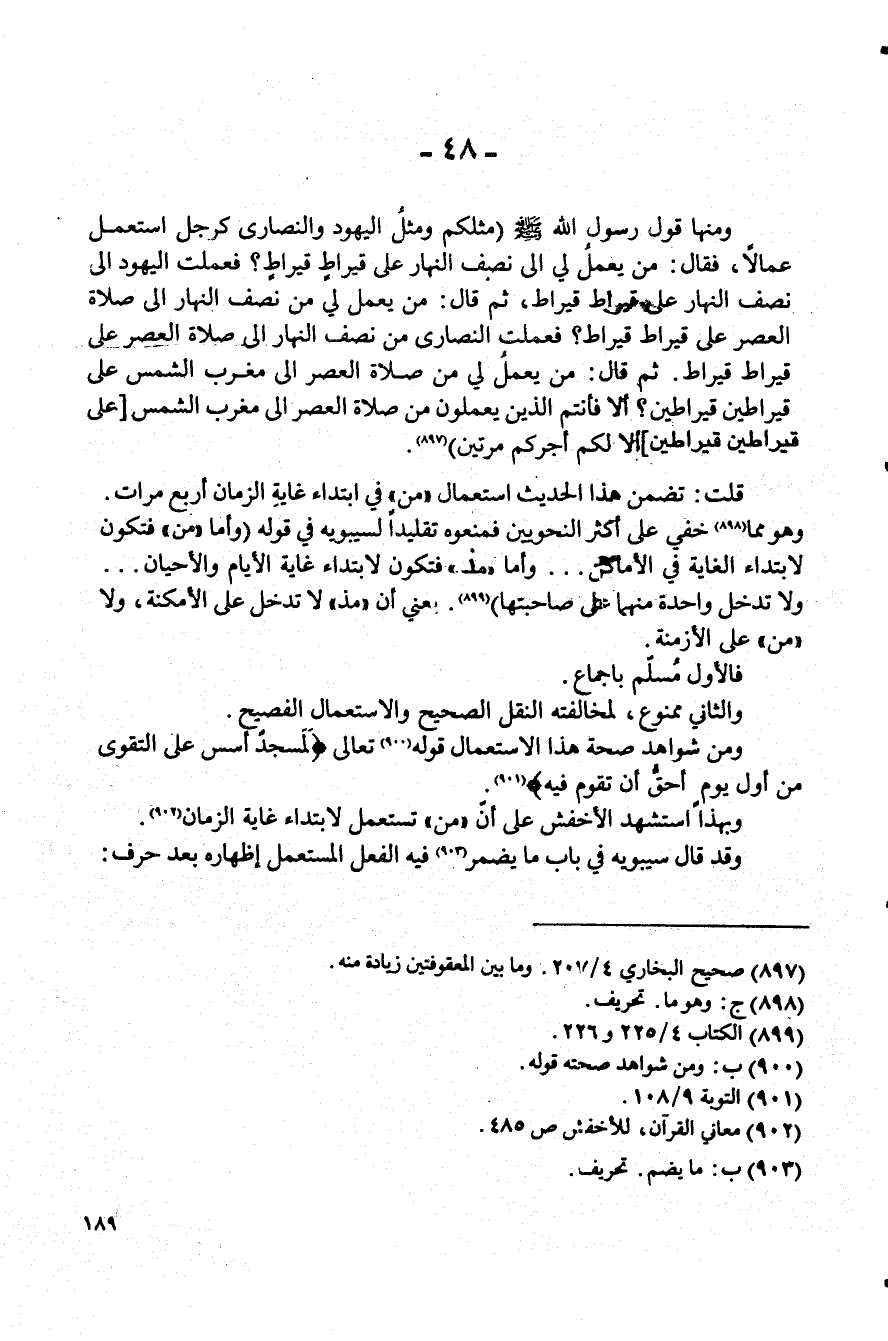 ومنها قول رسول الله - صلى الله عليه وسلم - (مثلكم ومثل اليهود والنصارى كرجل استعمل عمالًا، فقال: من يعمل لي إلى نصف النهار على قيراطٍ قيراطٍ؟ فعملت اليهود إلى نصف النهار على قيراط قيراط، ثم قال: من يعمل لي من نصف النهار إلى صلاة العصر على قيراط قيراط؟ فعملت النصارى من نصف النهار الى، صلاة العصر على قيراط قيراط. ثم قال: من يعمل لي من صلاة العصر إلى مغرب الشمس على قيراطين قيراطين؟ ألا فأنتم الذين يعملون من صلاة العصر إلى مغرب الشمس [على قيراطين قيراطين] ألا لكم أجركم مرتين) (¬897).