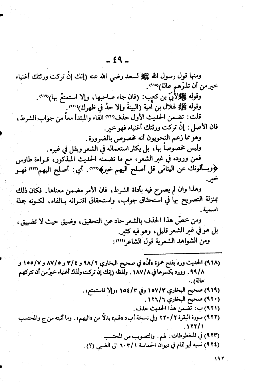 قلت: تضمن الحديث الأول حذف (¬921) الفاء والمبتدأ معًا من جواب الشرط، فإن الأصل: إن تركت ورثتك أغنياء فهو خير.