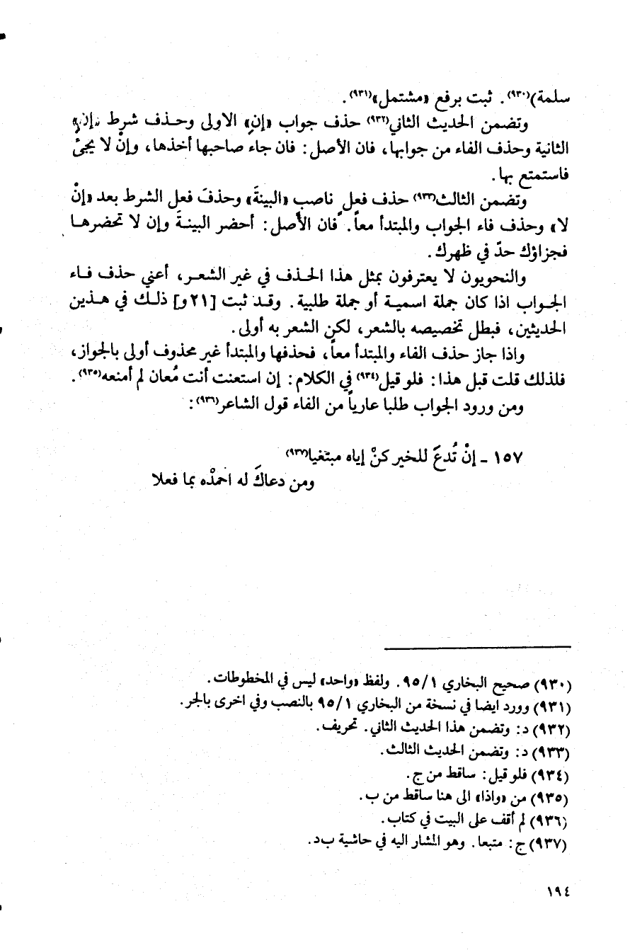 والنحويون لا يعترفون بمثل هذا الحذف في غير الشعر، أعني حذف فاء الجواب إذا كان جملة اسمية أو جملة طلبية. وقد ثبت [21 و] ذلك في هذين الحديثين، فبطل تخصيصه بالشعر، لكن الشعر به أولى.