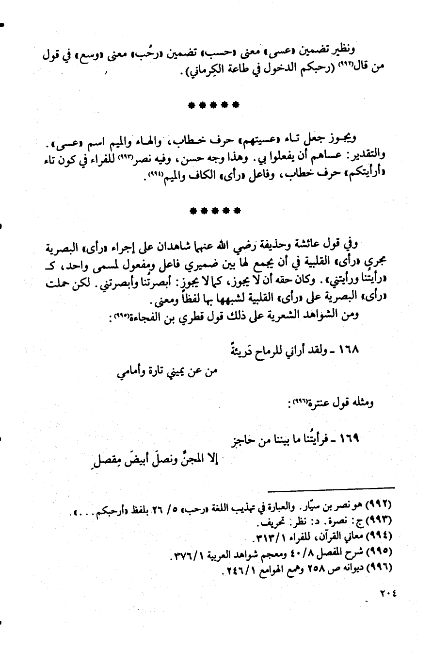 وفي قول عائشة وحذيفة رضي الله عنهما شاهدان على إجراء "رأى" البصرية مجرى "رأى" القلبية في أن يجمع لها بين ضميري فاعل ومفعول لمسمى واحد، ك "رأيتُنا ورأيتني". وكان حقه أن لا يجوز، كما لا يجوز: أبصرتُنا وأبصرتني. لكن حملت "رأى" البصرية على "رأى" القلبية لشبهها بها لفظًا ومعنى.