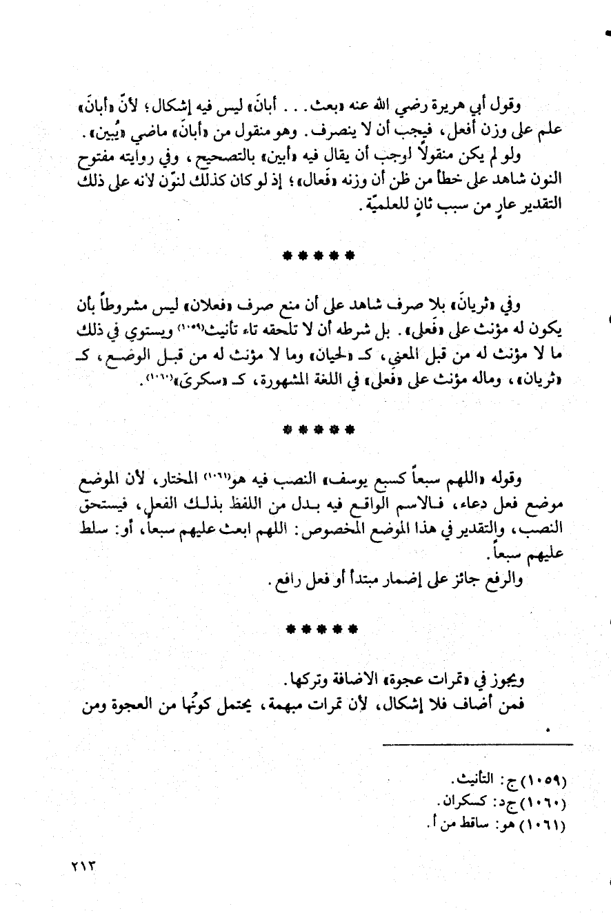 وفي "ثريانَ" بلا صرف شاهد على أن منع صرف " فعلان " ليس مشروطًا بأن يكون له مؤنث على"فعلى". بل شرطه أن لاتلحقه تاء تأنيث (¬1059) ويستوي في ذلك ما لا مؤنث له من قبل المعنى، ك "لحيان" وما لا مؤنث له من قبل الوضع, ك "ثريان"،، وماله مؤنث على "فعلى" في اللغة المشهورة, ك"سكرى". (¬1060).