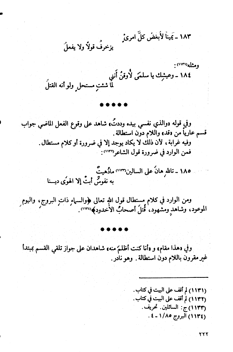ومن الوارد في كلام مستطال قول الله تعالى {وَالسَّمَاءِ ذَاتِ الْبُرُوجِ (1) وَالْيَوْمِ الْمَوْعُودِ (2) وَشَاهِدٍ وَمَشْهُودٍ (3) قُتِلَ أَصْحَابُ الْأُخْدُودِ} (¬1134)