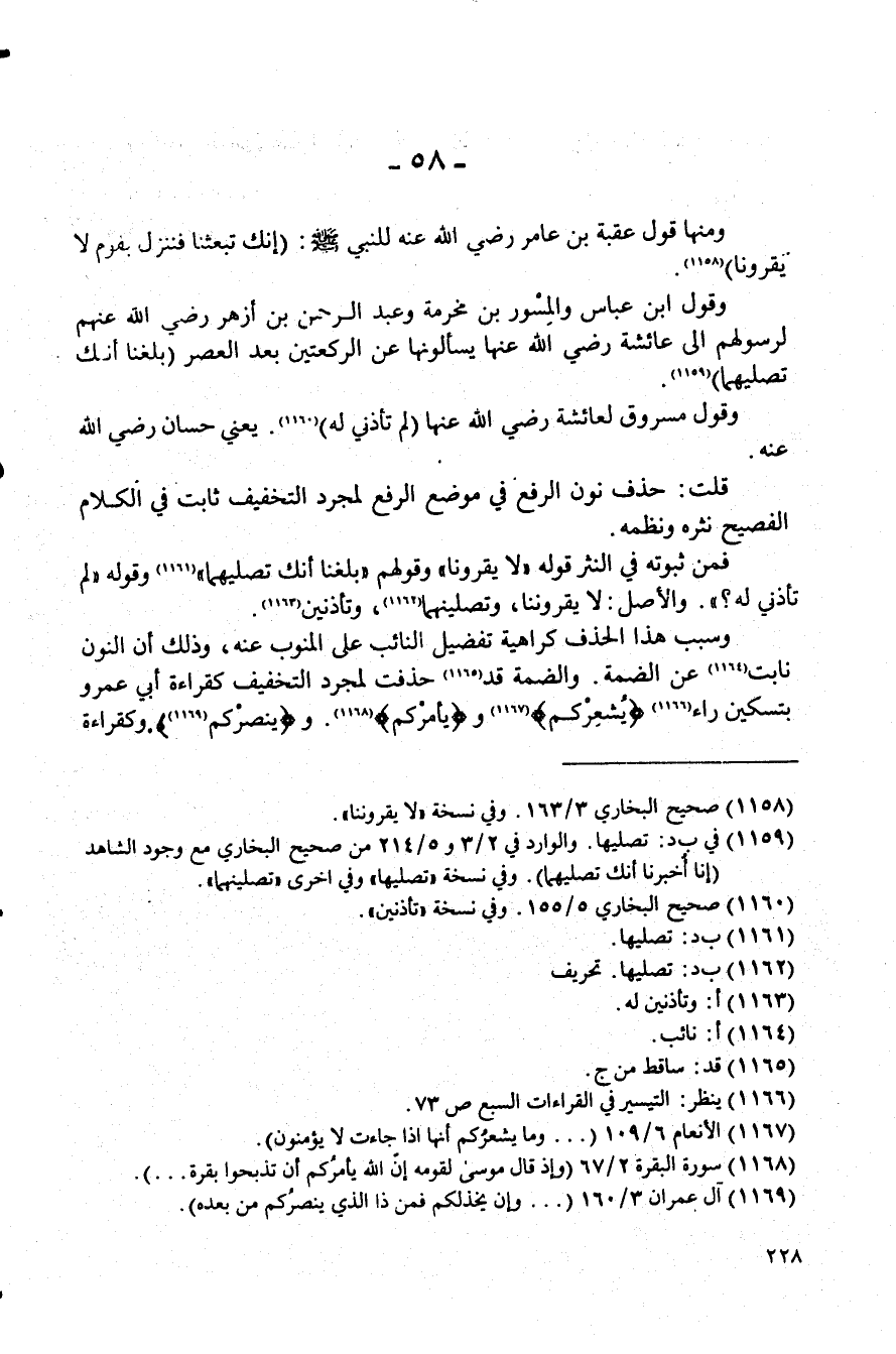 فمن ثبوته في النثر قوله "لا يقرونا" وقولهم "بلغنا أنك تصليهما" (¬1161) وقوله "لم تأذني له؟ ". والأصل: لا يقروننا، وتصلينهما (¬1162)، وتأذنين (¬1163).