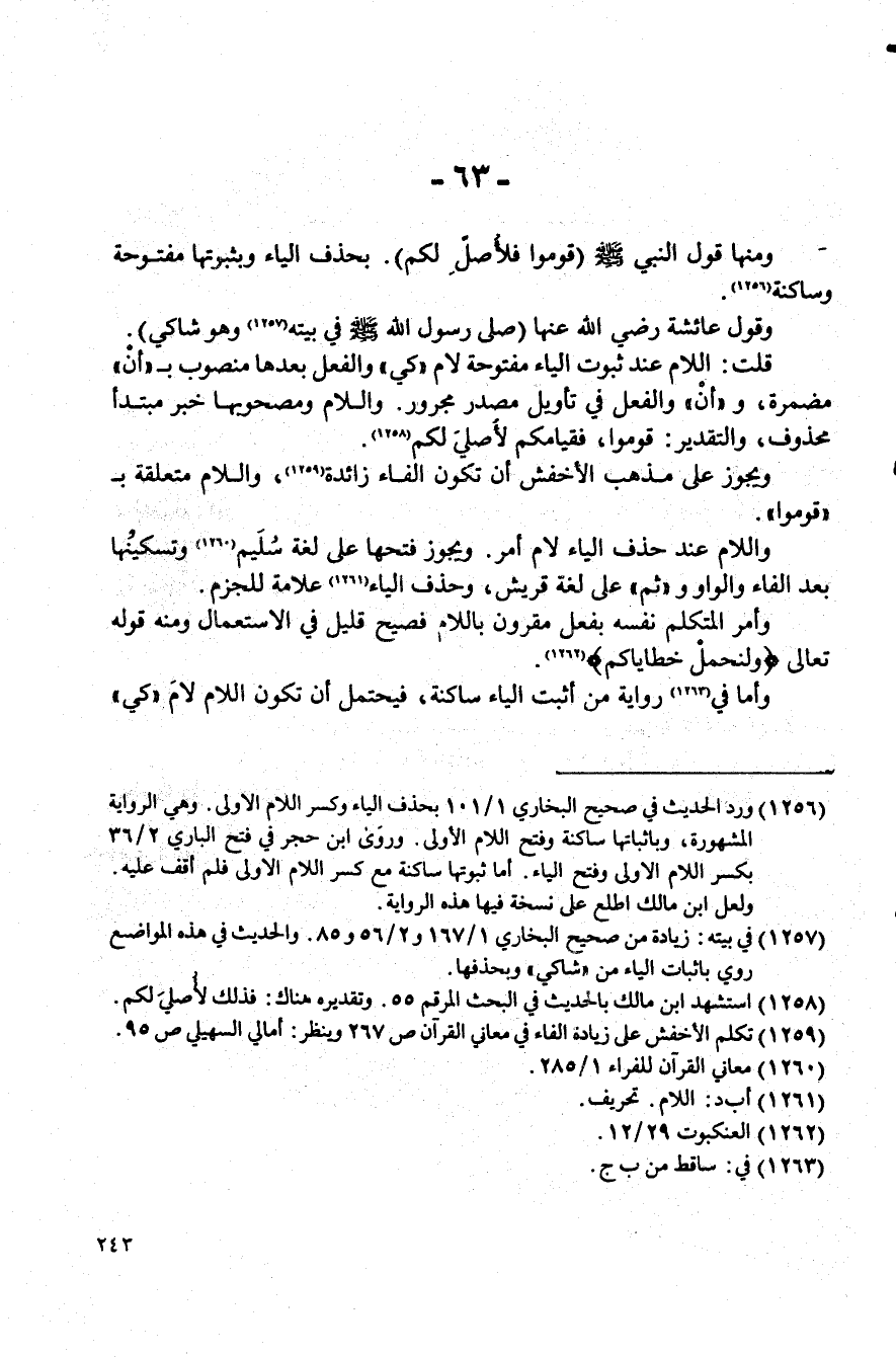 (¬1258) استشهد ابن مالك بالحديث في البحث المرقم 55. وتقديره هناك: فذلك لأصليَ لكم.