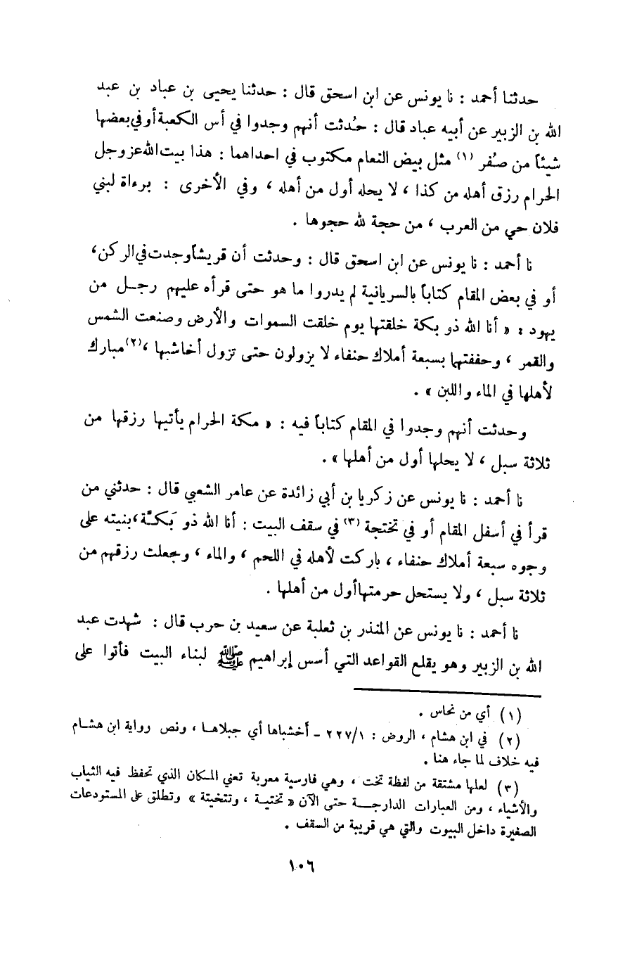 نا أحمد: نا يونس عن ابن اسحق قال: وحدثت أن قريشاً وجدت في الركن، أو في بعض المقام كتاباً بالسريانية لم يدروا ما هو حتى قرأه عليهم رجل من يهود: «أنا الله ذو بكة خلقتها يوم خلقت السموات والأرض وصنعت الشمس والقمر، وحففتهما بسبعة أملاك حنفاء لا يزولون حتى تزول أخاشبها، «2» مبارك لأهلها في الماء واللبن» .