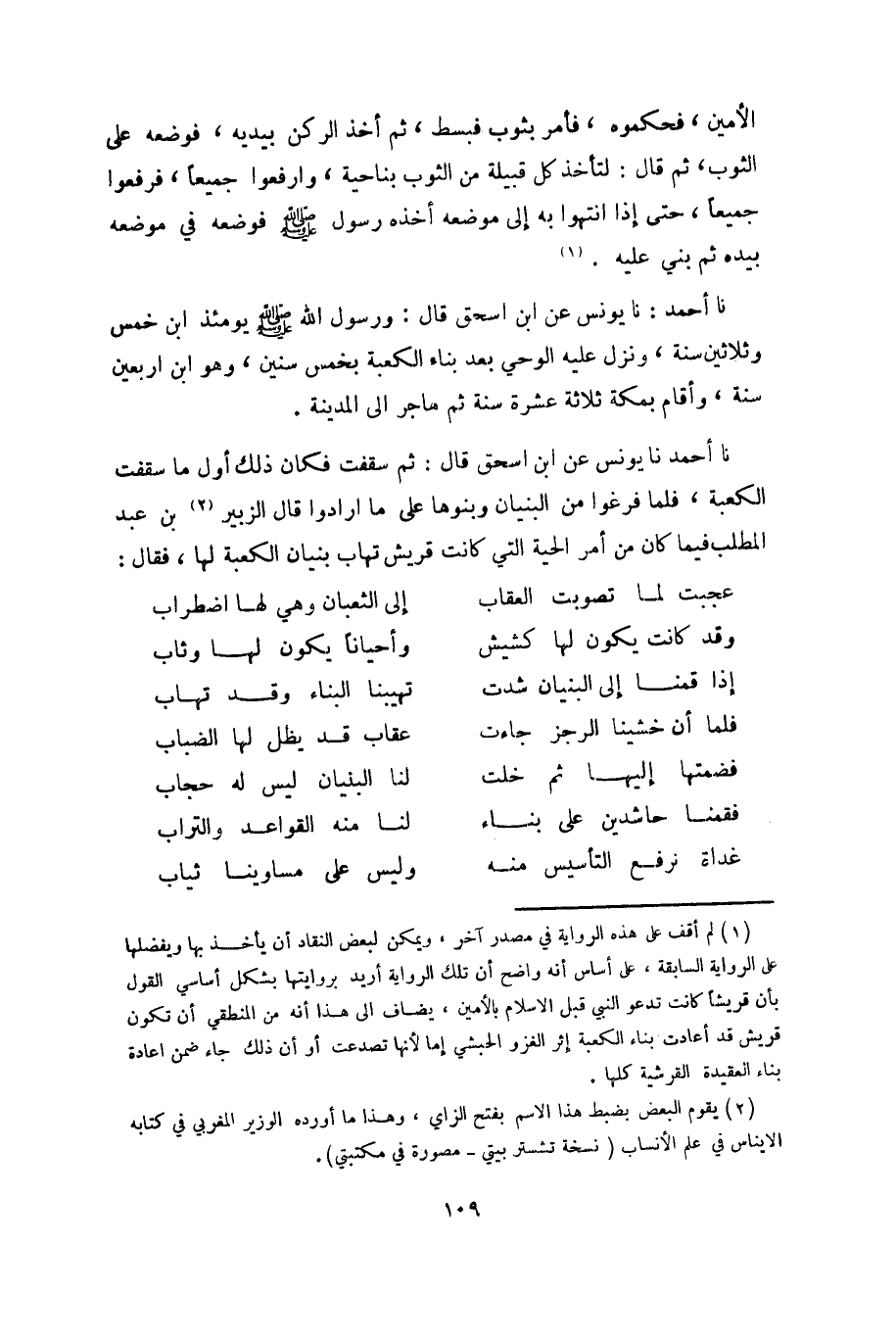 (1) لم أقف على هذه الرواية في مصدر آخر، ويمكن لبعض النقاد أن يأخذ بها ويفضلها على الرواية السابقة، على أساس أنه واضح أن تلك الرواية أريد بروايتها بشكل أساسي القول بأن قريشا كانت تدعو النبي قبل الاسلام بالأمين، يضاف الى هذا أنه من المنطقي أن تكون قريش قد أعادت بناء الكعبة إثر الغزو الحبشي إما لأنها تصدعت أو أن ذلك جاء ضمن اعادة بناء العقيدة القرشية كلها.