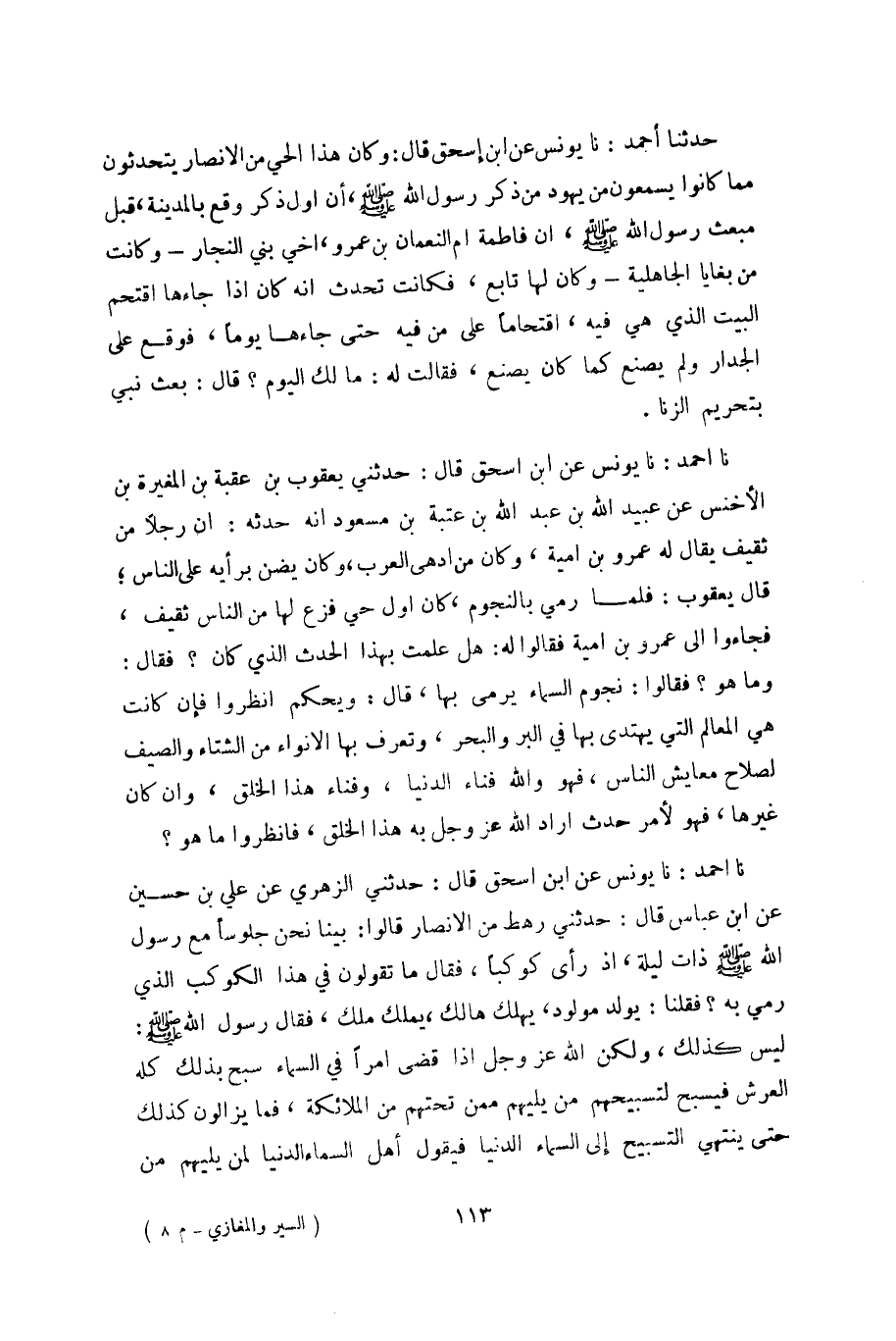 نا أحمد: نا يونس عن ابن إسحق قال: حدثني الزهري عن علي بن حسين عن ابن عباس قال: حدثني رهط من الأنصار قالوا: بينا نحن جلوساً مع رسول الله صلى الله عليه وسلم ذات ليلة، إذ رأى كوكباً، فقال ما تقولون في هذا الكوكب الذي رمي به؟ فقلنا: يولد مولود، يهلك هالك، يملك ملك، فقال رسول الله صلى الله عليه وسلم: