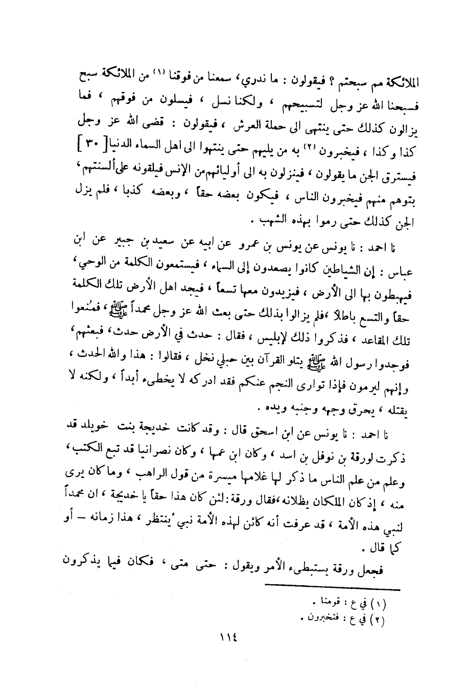 نا أحمد: نا يونس عن يونس بن عمرو عن أبيه عن سعيد بن جبير عن ابن عباس: إن الشياطين كانوا يصعدون إلى السماء، فيستمعون الكلمة من الوحي، فيهبطون بها إلى الأرض، فيزيدون معها تسعاً، فيجد أهل الأرض تلك الكلمة حقاً والتسع باطلاً، فلم يزالوا بذلك حتى بعث الله عز وجل محمداً صلى الله عليه وسلم، فمنعوا تلك المقاعد، فذكروا ذلك لإبليس، فقال: حدث في الأرض حدث، فبعثهم، فوجدوا رسول الله صلى الله عليه وسلم يتلو القرآن بين حبلي نخل، فقالوا: هذا والله الحدث، وإنهم ليرمون فإذا توارى النجم عنكم فقد أدركه لا يخطىء أبدا، ولكنه لا يقتله، يحرق وجهه وجنبه ويده.