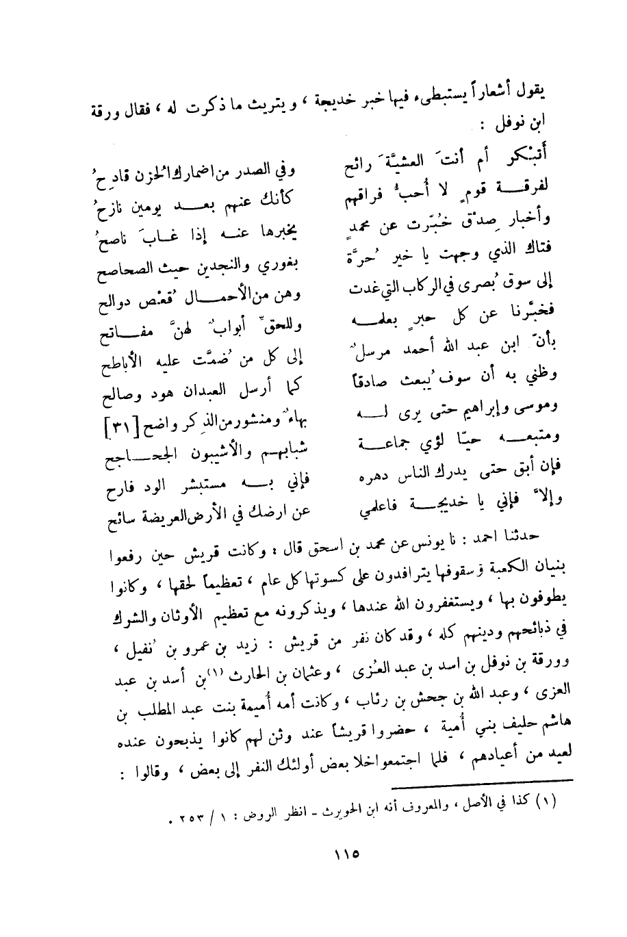 يقول أشعارا يستبطىء فيها خبر خديجة، ويتريث ما ذكرت له، فقال ورقة ابن نوفل: