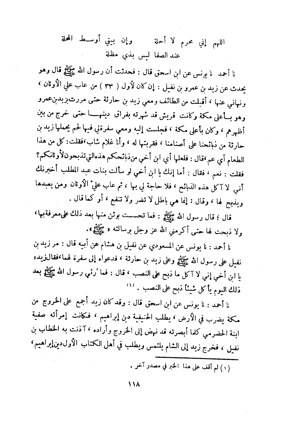 نا أحمد نا يونس عن ابن إسحق قال: فحدثت أن رسول الله صلى الله عليه وسلم قال وهو يحدث عن زيد بن عمرو بن نفيل: إن كان لأول (33) من عاب علي الأوثان، ونهاني عنها، أقبلت من الطائف ومعي زيد بن حارثة حتى مررت بزيد بن عمرو وهو بأعلى مكة وكانت قريش قد شهرته بفراق دينها حتى خرج من بين أظهرهم، وكان بأعلى مكة، فجلست إليه ومعي سفرة لي فيها لحم يحملها زيد بن حارثة من ذبائحنا على أصنامنا، فقربتها له، وأنا غلام شاب، فقلت: كل من هذا الطعام أي عم، قال: فلعلها أي ابن أخي من ذبائحكم هذه التي تذبحون لأوثانكم؟