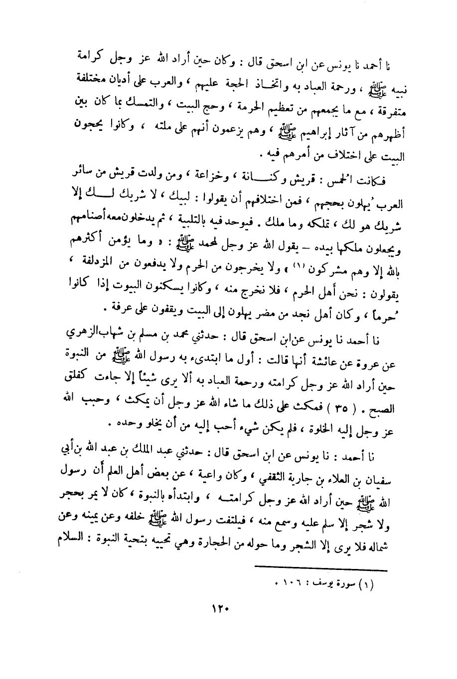 نا أحمد نا يونس عن ابن إسحق قال: حدثني محمد بن مسلم بن شهاب الزهري عن عروة عن عائشة أنها قالت: أول ما ابتدىء به رسول الله صلى الله عليه وسلم من النبوة حين أراد الله عز وجل كرامته ورحمة العباد به ألا يرى شيئاً إلا جاءت كفلق الصبح. (35) فمكث على ذلك ما شاء الله عز وجل أن يمكث، وحبب الله عز وجل إليه الخلوة، فلم يكن شيء أحب إليه من أن يخلو وحده.