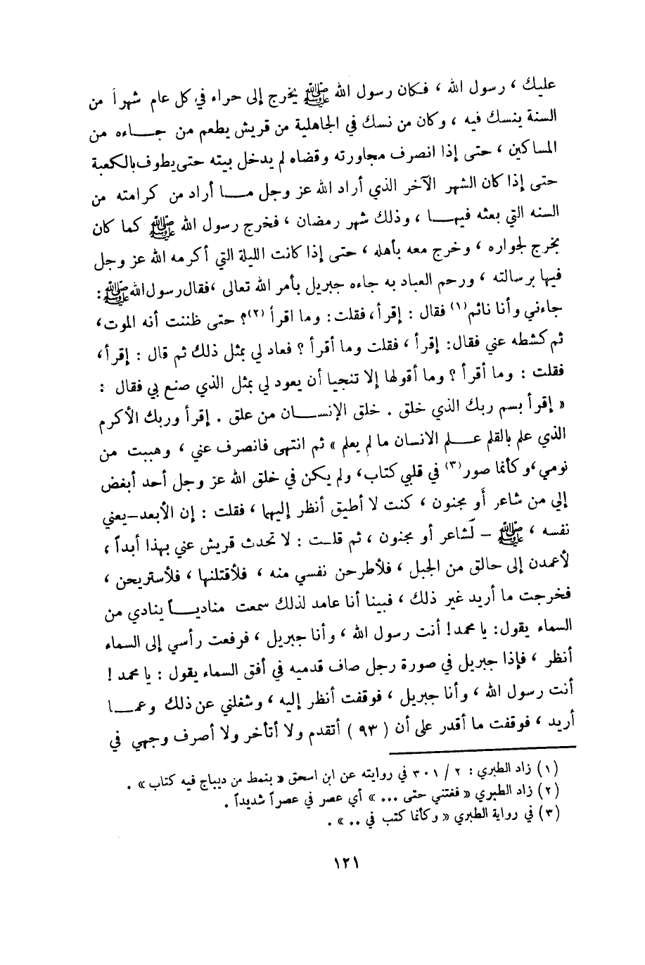 «اقْرَأْ بِاسْمِ رَبِّكَ الَّذِي خَلَقَ. خَلَقَ الْإِنْسانَ مِنْ عَلَقٍ. اقْرَأْ وَرَبُّكَ الْأَكْرَمُ الَّذِي عَلَّمَ بِالْقَلَمِ عَلَّمَ الْإِنْسانَ ما لَمْ يَعْلَمْ» ثم انتهى فانصرف عني، وهببت من نومي، وكأنما صور «3» في قلبي كتاب، ولم يكن في خلق الله عز وجل أحد أبغض إلي من شاعر أو مجنون، كنت لا أطيق أنظر إليهما، فقلت: إن الأبعد- يعني نفسه، صلى الله عليه وسلم- لشاعر أو مجنون، ثم قلت: لا تحدث قريش عني بهذا أبداً، لأعمدن إلى حالق من الجبل، فلأطرحن نفسي منه، فلأقتلنها، فلأستريحن، فخرجت ما أريد غير ذلك، فبينا أنا عامد لذلك سمعت منادياً ينادي من السماء يقول: يا محمد! أنت رسول الله، وأنا جبريل، فرفعت رأسي إلى السماء أنظر، فإذا جبريل في صورة رجل صاف قدميه في أفق السماء يقول: يا محمد! أنت رسول الله، وأنا جبريل، فوقفت أنظر إليه، وشغلني عن ذلك وعما أريد، فوقفت ما أقدر على أن (93) أتقدم ولا أتأخر ولا أصرف وجهي في