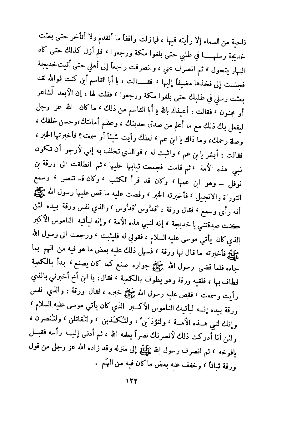 ناحية من السماء إلا رأيته فيها، فما زلت واقفا ما أتقدم ولا أتأخر حتى بعثت خديجة رسلها في طلبي حتى بلغوا مكة ورجعوا، فلم أزل كذلك حتى كاد النهار يتحول، ثم انصرف عني، وانصرفت راجعا إلى أهلي حتى أتيت خديجة فجلست إلى فخذها مضيفاً إليها، فقالت: يا أبا القاسم أين كنت فو الله لقد بعثت رسلي في طلبك حتى بلغوا مكة ورجعوا، فقلت لها: إن الأبعد لشاعر أو مجنون، فقالت: أعيذك بالله يا أبا القاسم من ذلك، ما كان الله عز وجل ليفعل بك ذلك مع ما أعلم من صدق حديثك، وعظم أمانتك، وحسن خلقك، وصلة رحمك، وما ذاك يا ابن عم، لعلك رأيت شيئاً أو سمعته؟ فأخبرتها الخبر، فقالت: أبشر يا بن عم، واثبت له، فو الذي تحلف به إني لأرجو أن تكون نبي هذه الأمة، ثم قامت فجمعت ثيابها عليها، ثم انطلقت إلى ورقة بن نوفل- وهو ابن عمها، وكان قد قرأ الكتب، وكان قد تنصر، وسمع التوراة والانجيل، فاخبرته الخبر، وقصت عليه ما قص عليها رسول الله صلى الله عليه وسلم أنه رأى وسمع، فقال ورقة: قدوس قدوس، والذي نفس ورقة بيده لئن كنت صدقتني يا خديجة، إنه لنبي هذه الأمة، وإنه ليأتيه الناموس الأكبر الذي كان يأتي موسى عليه السلام، فقولي له فليثبت، ورجعت إلى رسول الله صلى الله عليه وسلم فأخبرته ما قال لها ورقة، فسهل ذلك عليه بعض ما هو فيه من الهم بما جاءه فلما قضى رسول الله صلى الله عليه وسلم جواره صنع كما كان يصنع، بدأ بالكعبة فطاف بها، فلقيه ورقة وهو يطوف بالكعبة، فقال: يا ابن أخ أخبرني بالذي رأيت وسمعت، فقص عليه رسول الله صلى الله عليه وسلّم خبره، فقال ورقة: والذي نفس ورقة بيده إنه ليأتيك الناموس الأكبر الذي كان يأتي موسى عليه السلام، وإنك لنبي هذه الأمة، ولتؤذين، ولتكذبن، ولتقاتلن، ولتنصرن، ولئن أنا أدركت ذلك لأنصرنك نصراً يعلمه الله، ثم أدنى إليه رأسه فقبل يافوخه، ثم انصرف رسول الله صلى الله عليه وسلم إلى منزله وقد زاده الله عز وجل من قول ورقة ثباتاً، وخفف عنه بعض ما كان فيه من الهم.