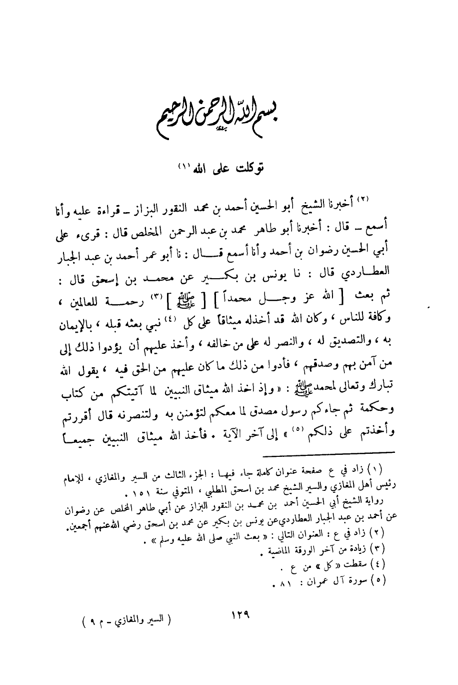 (1) زاد في ع صفحة عنوان كاملة جاء فيها: الجزء الثالث من السير والمغازي، للإمام رئيس أهل المغازي والسير الشيخ محمد بن إسحق المطلبي، المتوفي سنة 151. رواية الشيخ أبي الحسين أحمد بن محمد بن النقور البزاز عن أبي طاهر المخلص عن رضوان عن أحمد بن عبد الجبار العطاردي عن يونس بن بكير عن محمد بن اسحق رضي الله عنهم أجمعين.
