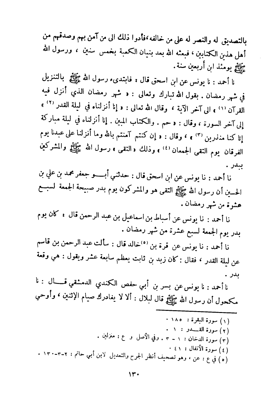 نا أحمد: نا يونس عن ابن إسحق قال: فابتدىء رسول الله صلى الله عليه وسلم بالتنزيل في شهر رمضان. بقول الله تبارك وتعالى: «شَهْرُ رَمَضانَ الَّذِي أُنْزِلَ فِيهِ الْقُرْآنُ «1» » إلى آخر الآية، وقال الله تعالى: «إِنَّا أَنْزَلْناهُ فِي لَيْلَةِ الْقَدْرِ «2» » إلى آخر السورة، وقال: «حم. وَالْكِتابِ الْمُبِينِ. إِنَّا أَنْزَلْناهُ فِي لَيْلَةٍ مُبارَكَةٍ إِنَّا كُنَّا مُنْذِرِينَ «3» » ، وقال: «إِنْ كُنْتُمْ آمَنْتُمْ بِاللَّهِ وَما أَنْزَلْنا عَلى عَبْدِنا يَوْمَ الْفُرْقانِ يَوْمَ الْتَقَى الْجَمْعانِ «4» » وذلك «التقى» رسول الله صلى الله عليه وسلم والمشركين ببدر.