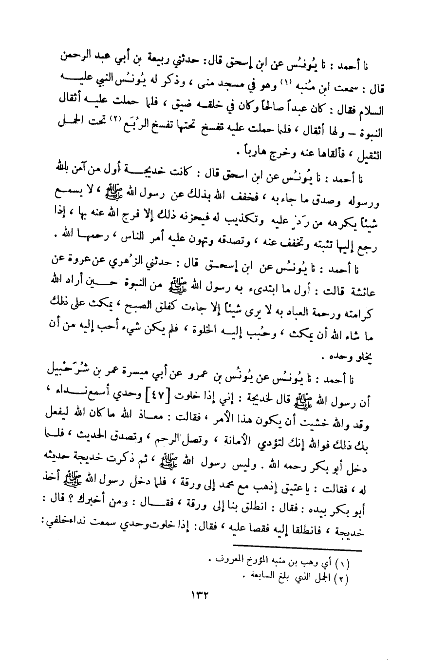 نا أحمد: نا يونس عن ابن إسحق قال: حدثني الزهري عن عروة عن عائشة قالت: أول ما ابتدىء به رسول الله صلى الله عليه وسلم من النبوة حين أراد الله كرامته ورحمة العباد به لا يرى شيئاً إلا جاءت كفلق الصبح، يمكث على ذلك ما شاء الله أن يمكث، وحبب إليه الخلوة، فلم يكن شيء أحب إليه من أن يخلو وحده.