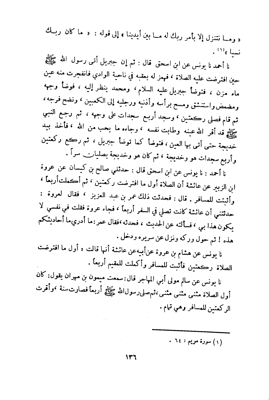 نا أحمد: نا يونس عن ابن إسحق قال: حدثني صالح بن كيسان عن عروة ابن الزبير عن عائشة أن الصلاة أول ما افترضت ركعتين، ثم أكملت أربعاً، وأثبتت للمسافر. قال: فحدثت ذلك عمر بن عبد العزيز، فقال لعروة: