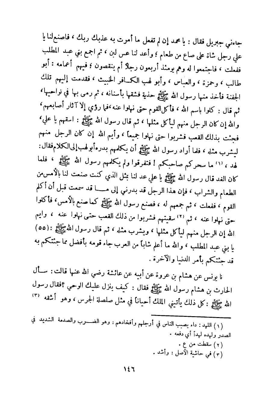 لهد، «1» ما سحركم صاحبكم! فتفرقوا ولم يكلمهم رسول الله صلى الله عليه وسلم، فلما كان الغد قال رسول الله صلى الله عليه وسلم يا علي عد لنا بمثل الذي كنت صنعت لنا بالأمس من الطعام والشراب، فإن هذا الرجل قد بدرني إلى ما قد سمعت قبل أن أكلم القوم، ففعلت، ثم جمعهم له، فصنع رسول الله صلى الله عليه وسلم كما صنع بالأمس، فأكلوا حتى نهلوا عنه، ثم «2» سقيتهم فشربوا من ذلك القعب حتى نهلوا عنه، وأيم الله إن الرجل منهم ليأكل مثلها، ويشرب مثله، ثم قال رسول الله صلى الله عليه وسلم: (55) يا بني عبد المطلب، والله ما أعلم شاباً من العرب جاء قومه بأفضل مما جئتكم به قد جئتكم بأمر الدنيا والآخرة.