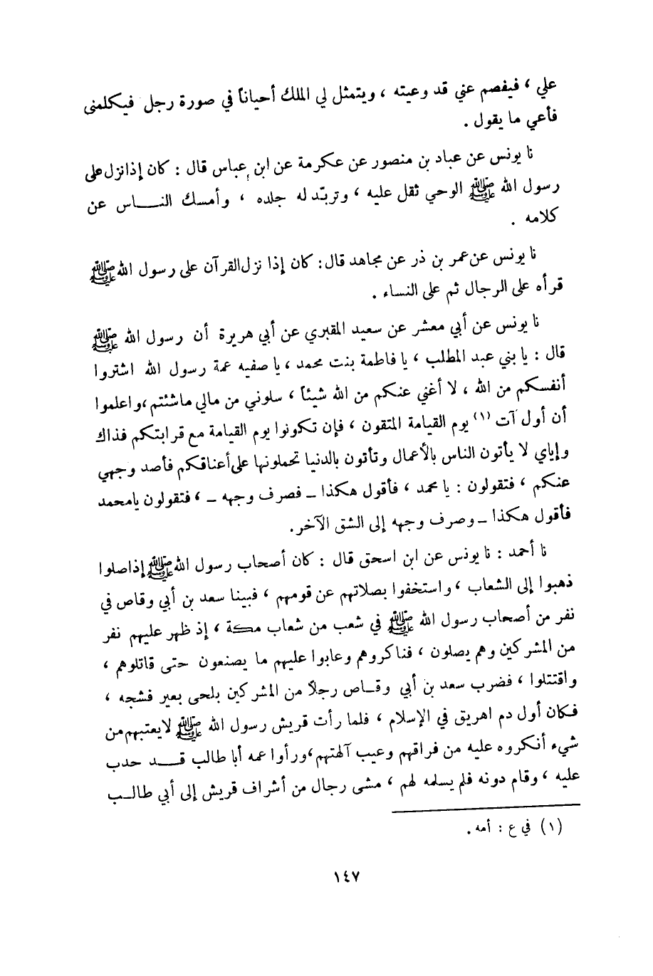 نا أحمد: نا يونس عن ابن إسحق قال: كان أصحاب رسول الله صلى الله عليه وسلم إذا صلوا ذهبوا إلى الشعاب، واستخفوا بصلاتهم عن قومهم، فبينا سعد بن أبي وقاص في نفر من أصحاب رسول الله صلى الله عليه وسلم في شعب من شعاب مكة، إذ ظهر عليهم نفر من المشركين وهم يصلون، فناكروهم وعابوا عليهم ما يصنعون حتى قاتلوهم، واقتتلوا، فضرب سعد بن أبي وقاص رجلاً من المشركين بلحى بعير فشجه، فكان أول دم اهريق في الإسلام، فلما رأت قريش رسول الله صلى الله عليه وسلم لا يعتبهم من شيء أنكروه عليه من فراقهم وعيب آلهتهم، ورأوا عمه أبا طالب قد حدب عليه، وقام دونه فلم يسلمه لهم، مشى رجال من أشراف قريش إلى أبي طالب