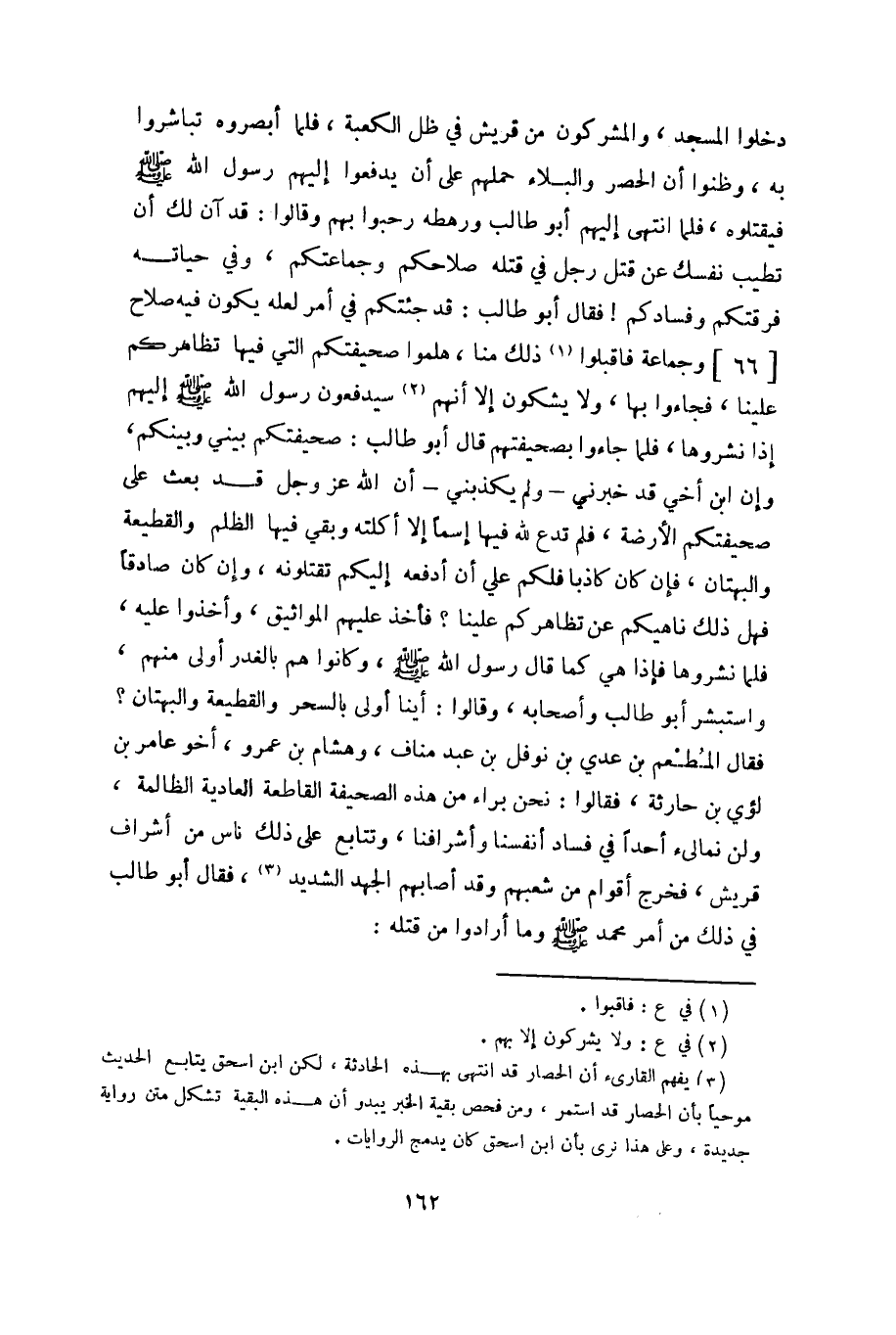 دخلوا المسجد، والمشركون من قريش في ظل الكعبة، فلما أبصروه تباشروا به، وظنوا أن الحصر والبلاء حملهم على أن يدفعوا إليهم رسول الله صلى الله عليه وسلم فيقتلوه، فلما انتهى إليهم أبو طالب ورهطه رحبوا بهم وقالوا: قد آن لك أن تطيب نفسك عن قتل رجل في قتله صلاحكم وجماعتكم، وفي حياته فرقتكم وفسادكم! فقال أبو طالب: قد جئتكم في أمر لعله يكون فيه صلاح [66] وجماعة فاقبلوا «1» ذلك منا، هلموا صحيفتكم التي فيها تظاهركم علينا، فجاءوا بها، ولا يشكون إلا أنهم «2» سيدفعون رسول الله صلى الله عليه وسلم إليهم إذا نشروها، فلما جاءوا بصحيفتهم قال أبو طالب: صحيفتكم بيني وبينكم، وإن ابن أخي قد خبرني- ولم يكذبني- أن الله عز وجل قد بعث على صحيفتكم الأرضة، فلم تدع لله فيها إسماً إلا أكلته وبقي فيها الظلم والقطيعة والبهتان، فإن كان كاذبا فلكم علي أن أدفعه إليكم تقتلونه، وإن كان صادقاً فهل ذلك ناهيكم عن تظاهركم علينا؟ فأخذ عليهم المواثيق، وأخذوا عليه، فلما نشروها فإذا هي كما قال رسول الله صلى الله عليه وسلم، وكانوا هم بالغدر أولى منهم، واستبشر أبو طالب وأصحابه، وقالوا: أينا أولى بالسحر والقطيعة والبهتان؟