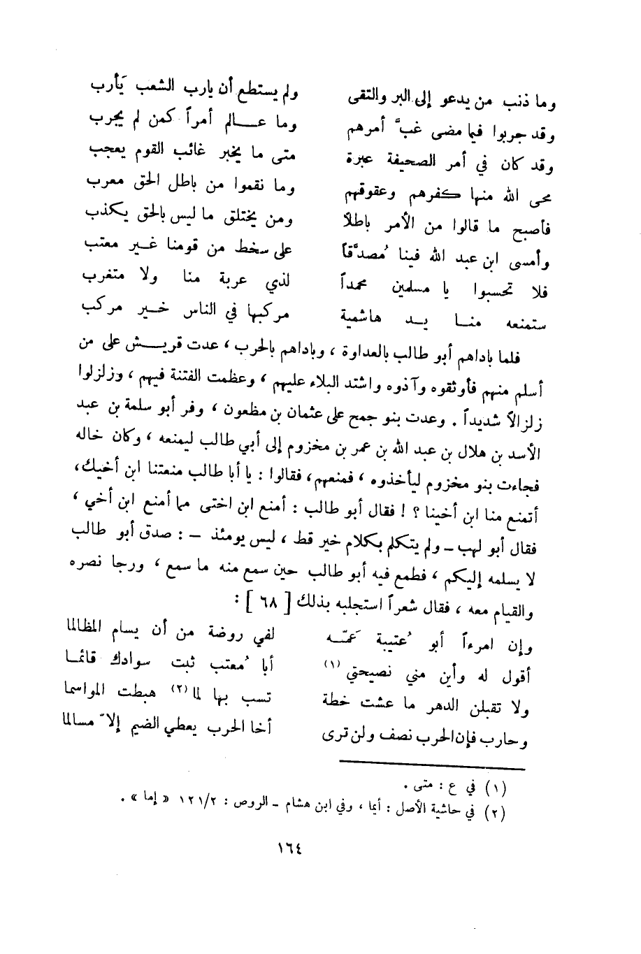 فلما باداهم أبو طالب بالعداوة، وباداهم بالحرب، عدت قريش على من أسلم منهم فأوثقوه وآذوه واشتد البلاء عليهم، وعظمت الفتنة فيهم، وزلزلوا زلزالاً شديداً. وعدت بنو جمح على عثمان بن مظعون، وفر أبو سلمة بن عبد الأسد بن هلال بن عبد الله بن عمر بن مخزوم إلى أبي طالب ليمنعه، وكان خاله فجاءت بنو مخزوم ليأخذوه، فمنعهم، فقالوا: يا أبا طالب منعتنا ابن أخيك، أتمنع منا ابن أخينا؟! فقال أبو طالب: أمنع ابن اختي مما أمنع ابن أخي، فقال أبو لهب- ولم يتكلم بكلام خير قط، ليس يومئذ-: صدق أبو طالب لا يسلمه إليكم، فطمع فيه أبو طالب حين سمع منه ما سمع، ورجا نصره والقيام معه، فقال شعراً استجلبه بذلك [68] :