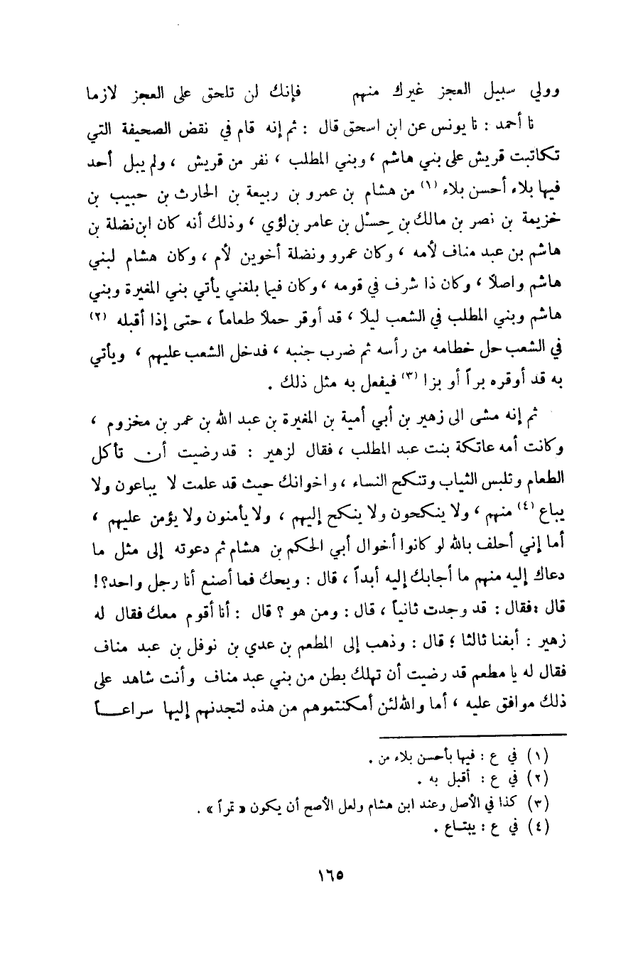 ثم إنه مشى إلى زهير بن أبي أمية بن المغيرة بن عبد الله بن عمر بن مخزوم، وكانت أمه عاتكة بنت عبد المطلب، فقال لزهير: قد رضيت أن تأكل الطعام وتلبس الثياب وتنكح النساء، واخوانك حيث قد علمت لا يباعون ولا يباع «4» منهم، ولا ينكحون ولا ينكح إليهم، ولا يأمنون ولا يؤمن عليهم، أما إني أحلف بالله لو كانوا أخوال أبي الحكم بن هشام ثم دعوته إلى مثل ما دعاك إليه منهم ما أجابك إليه أبداً، قال: ويحك فما أصنع أنا رجل واحد؟! قال: فقال: قد وجدت ثانياً، قال: ومن هو؟ قال: أنا أقوم معك فقال له زهير: أبغنا ثالثا؛ قال: وذهب إلى المطعم بن عدي بن نوفل بن عبد مناف فقال له يا مطعم قد رضيت أن تهلك بطن من بني عبد مناف وأنت شاهد على ذلك موافق عليه، أما والله لئن أمكنتموهم من هذه لتجدنهم إليها سراعا