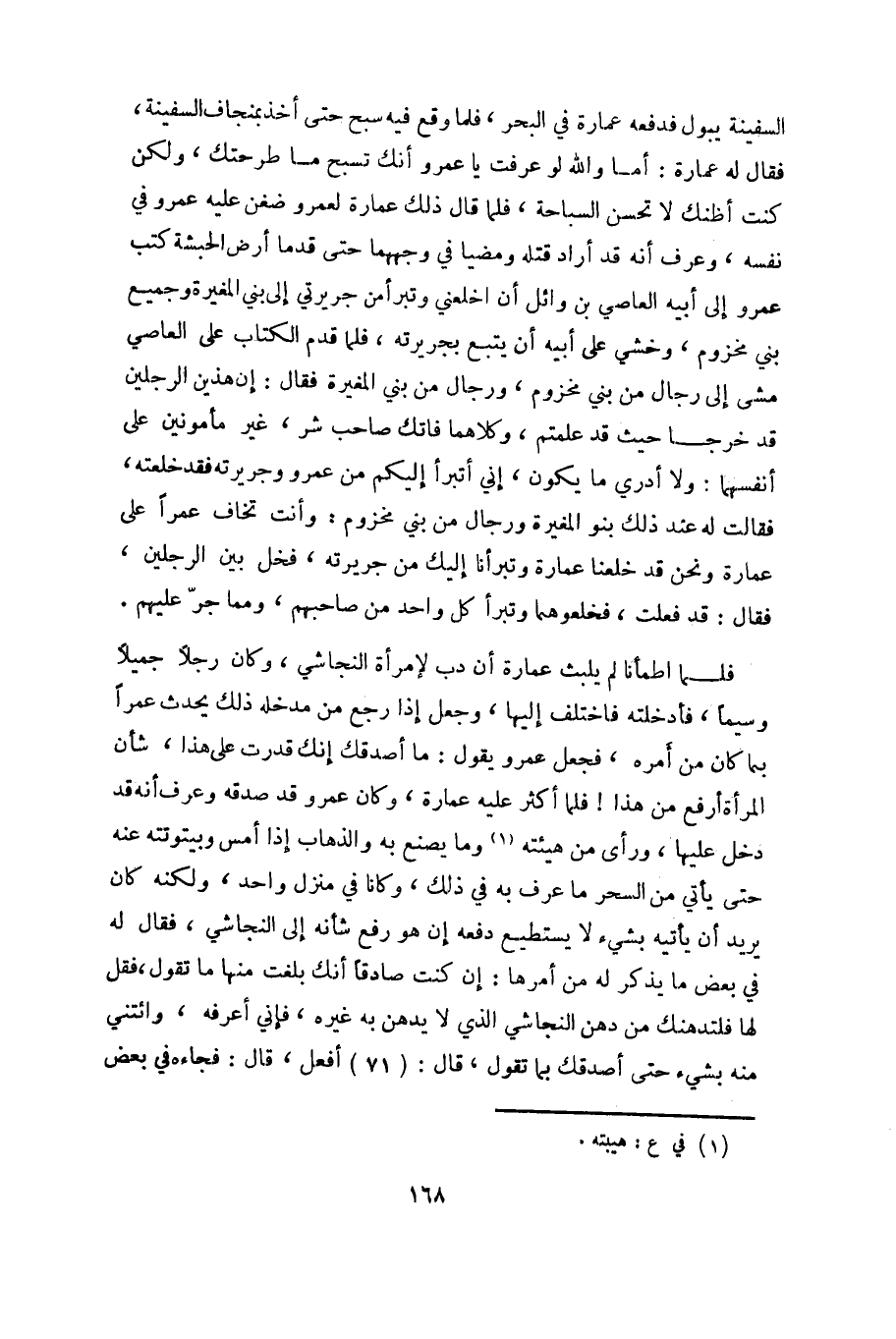 فلما اطمأنا لم يلبث عمارة أن دب لإمرأة النجاشي، وكان رجلاً جميلاً وسيماً، فأدخلته فاختلف إليها، وجعل إذا رجع من مدخله ذلك يحدث عمراً بما كان من أمره، فجعل عمرو يقول: ما أصدقك إنك قدرت على هذا، شأن المرأة أرفع من هذا! فلما أكثر عليه عمارة، وكان عمرو قد صدقه وعرف أنه قد دخل عليها، ورأى من هيئته «1» وما يصنع به والذهاب إذا أمسى وبيتوتته عنه حتى يأتي من السحر ما عرف به في ذلك، وكانا في منزل واحد، ولكنه كان يريد أن يأتيه بشيء لا يستطيع دفعه إن هو رفع شأنه إلى النجاشي، فقال له في بعض ما يذكر له من أمرها: إن كنت صادقاً أنك بلغت منها ما تقول، فقل لها فلتدهنك من دهن النجاشي الذي لا يدهن به غيره، فإني أعرفه، وائتني منه بشيء حتى أصدقك بما تقول، قال: (71) أفعل، قال: فجاءه في بعض